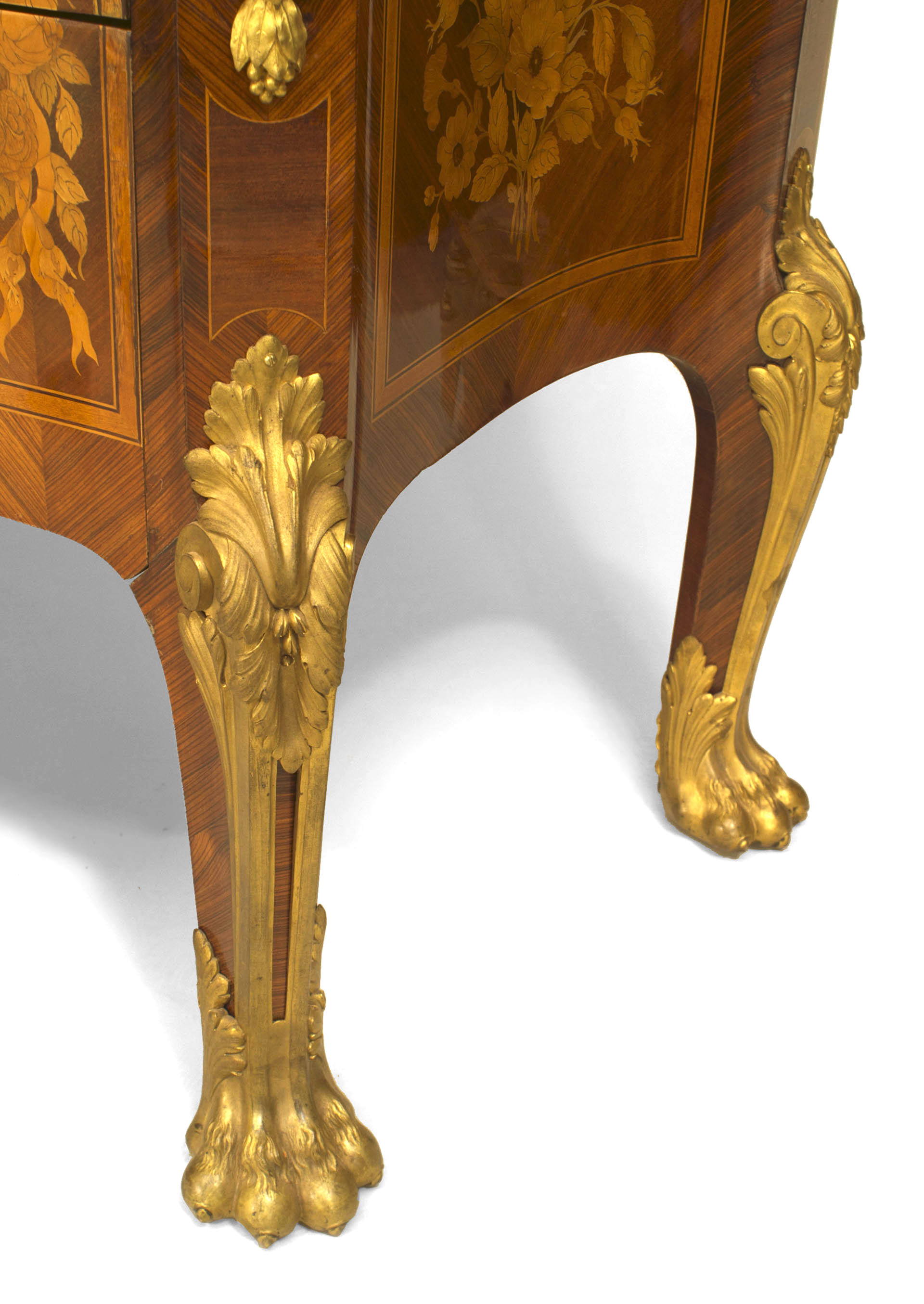 French Louis XV style (circa 1880) transitional style gilt bronze mounted kingwood & satinwood 3 drawer commode with floral inlaid design and a fleur de peche marble top (attributed to MAISON KRIEGER)