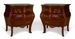 PAIR of French Louis XV-style (19/20th Century) fruitwood bombe-shaped bedside commodes / tables with three drawers, bronze trim, and a shaped green marble top. (PRICED AS PAIR)