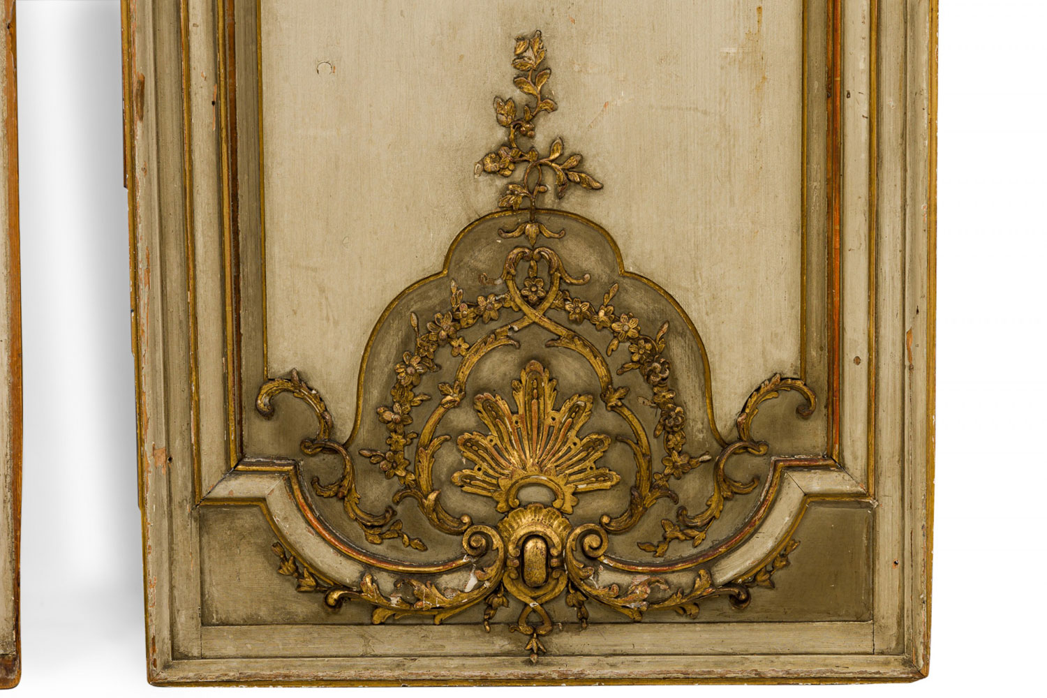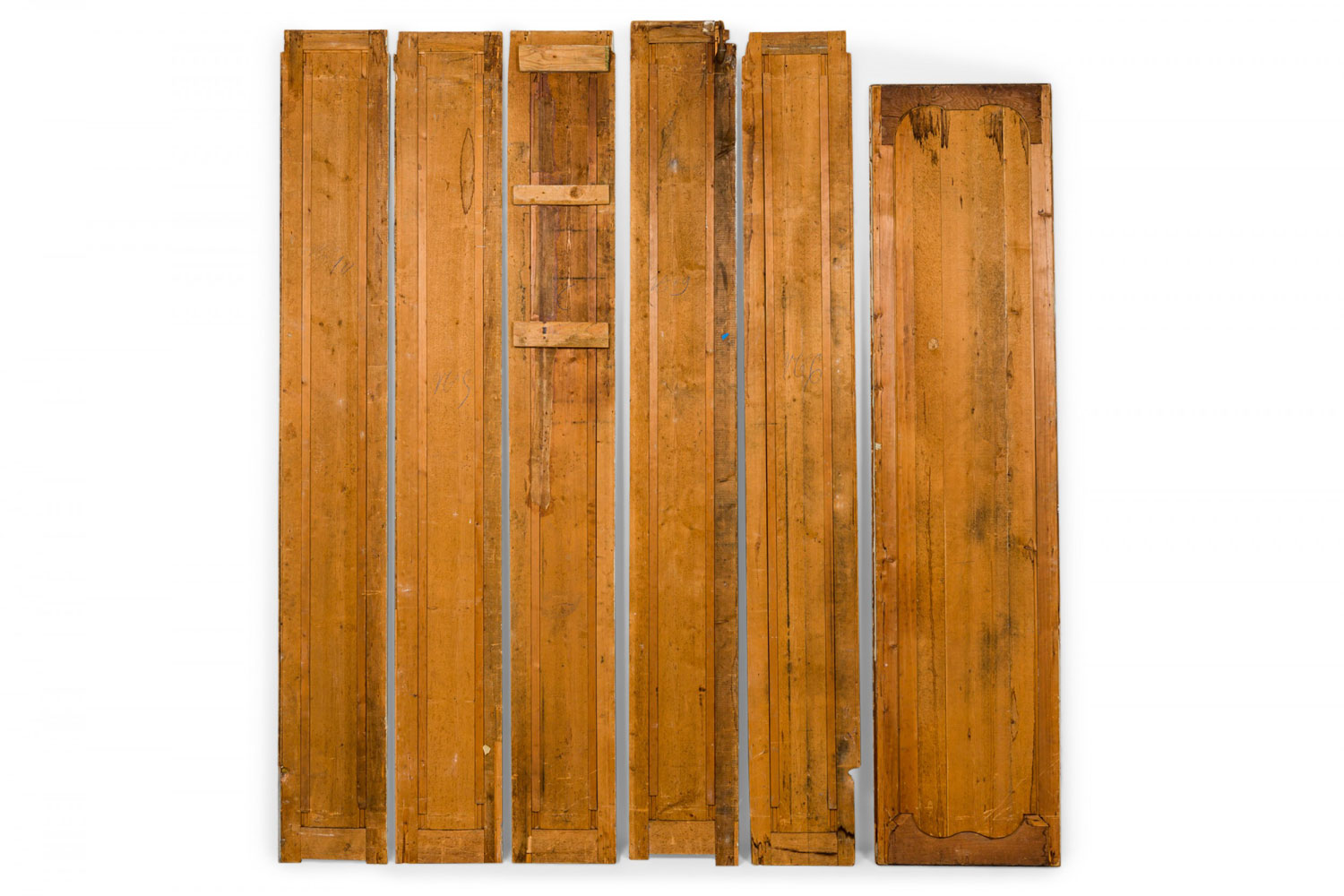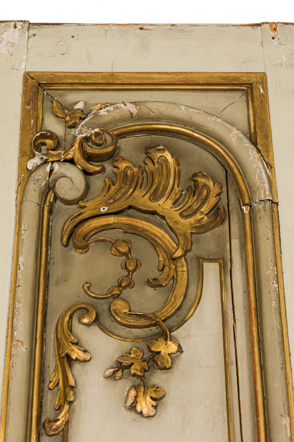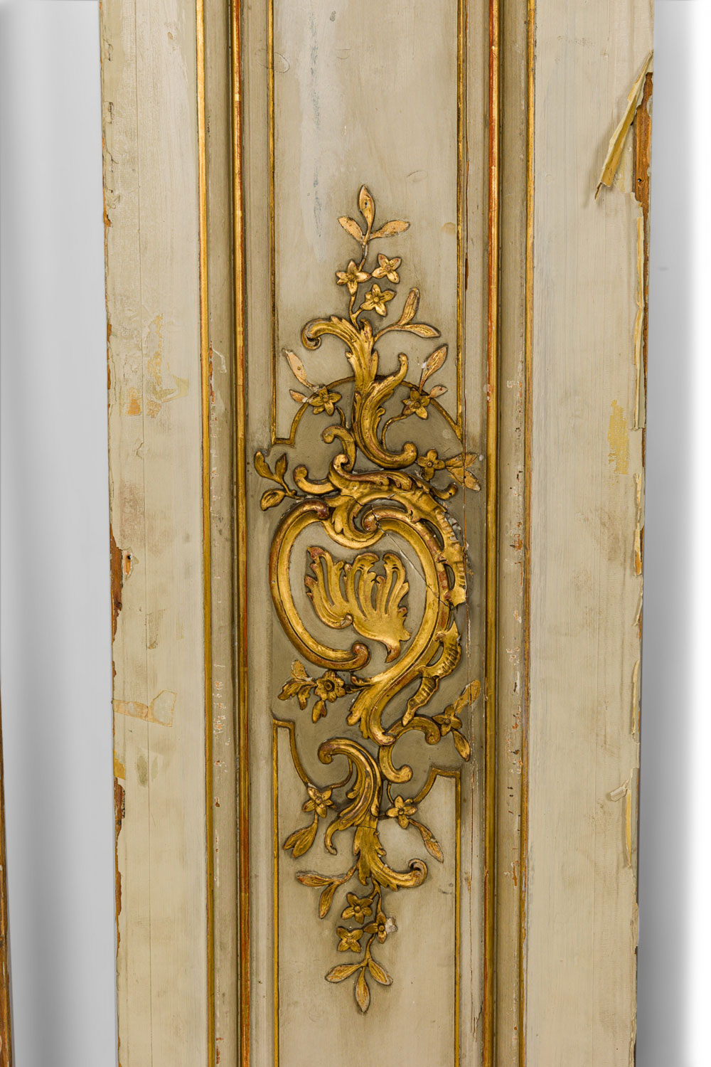 6 French Louis XV style (19th Century) white and gold painted pilaster panels. Size variance, 1 panel: 25" wide, 5 panels: 15" wide. (PRICED AS SET)