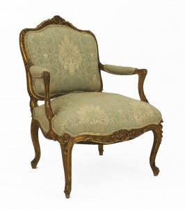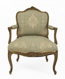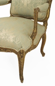 SET of 4 French Louis XV-style (19th Cent) gilt living room / salon set with light green damask upholstery. 3 arm chairs: 27½"w 30"d 37½"h/1 loveseat: 76 "w, 33"d, 43.25"h..