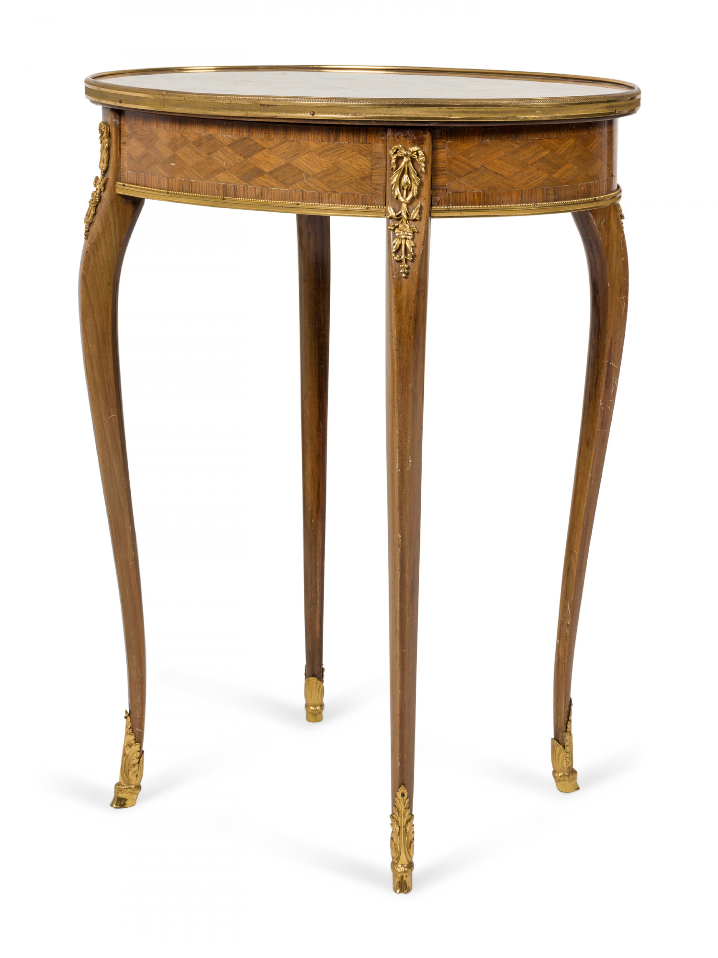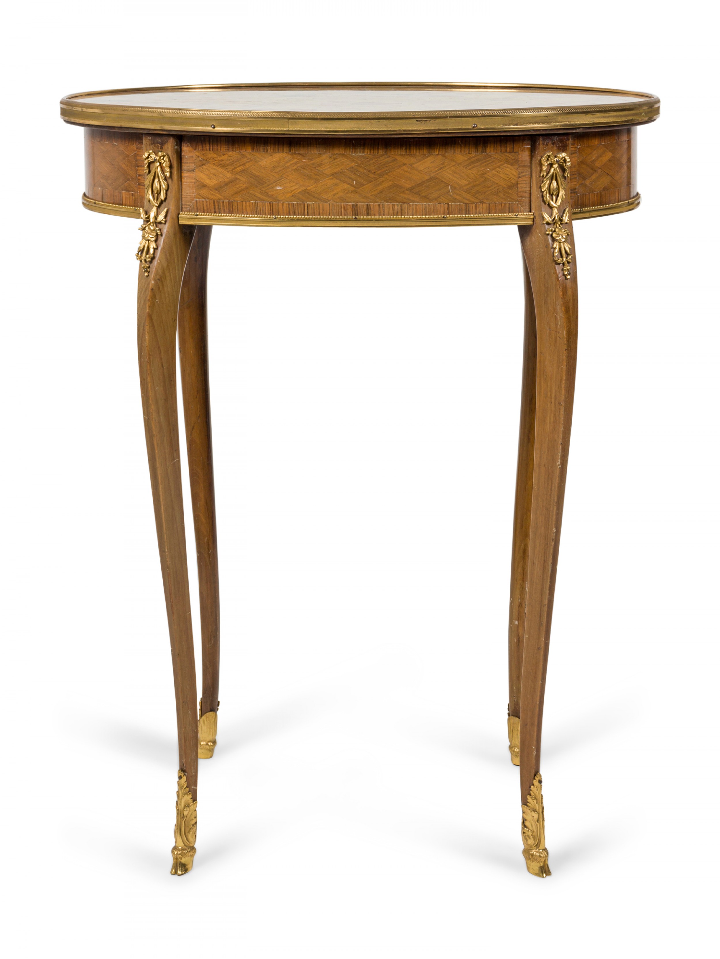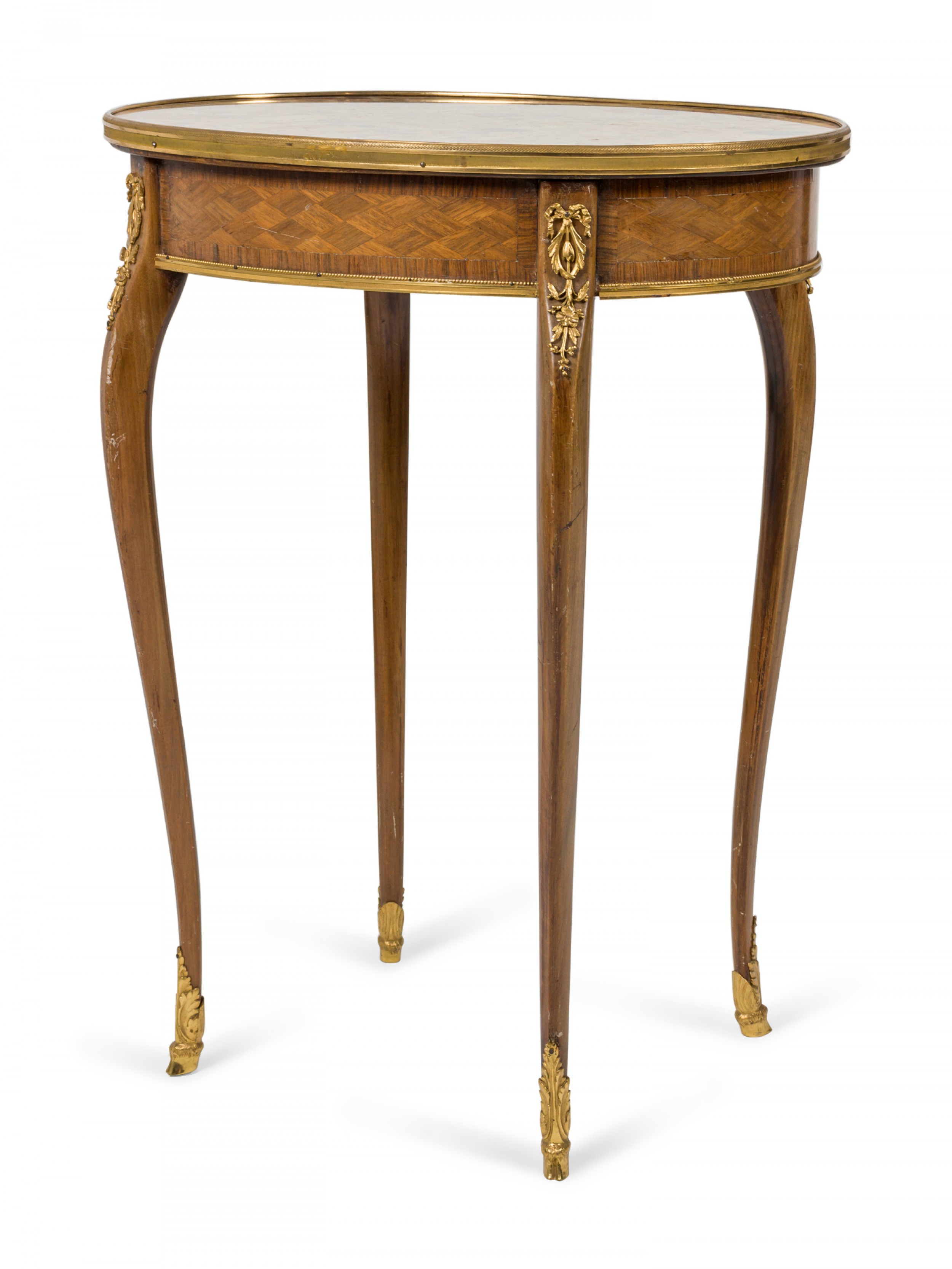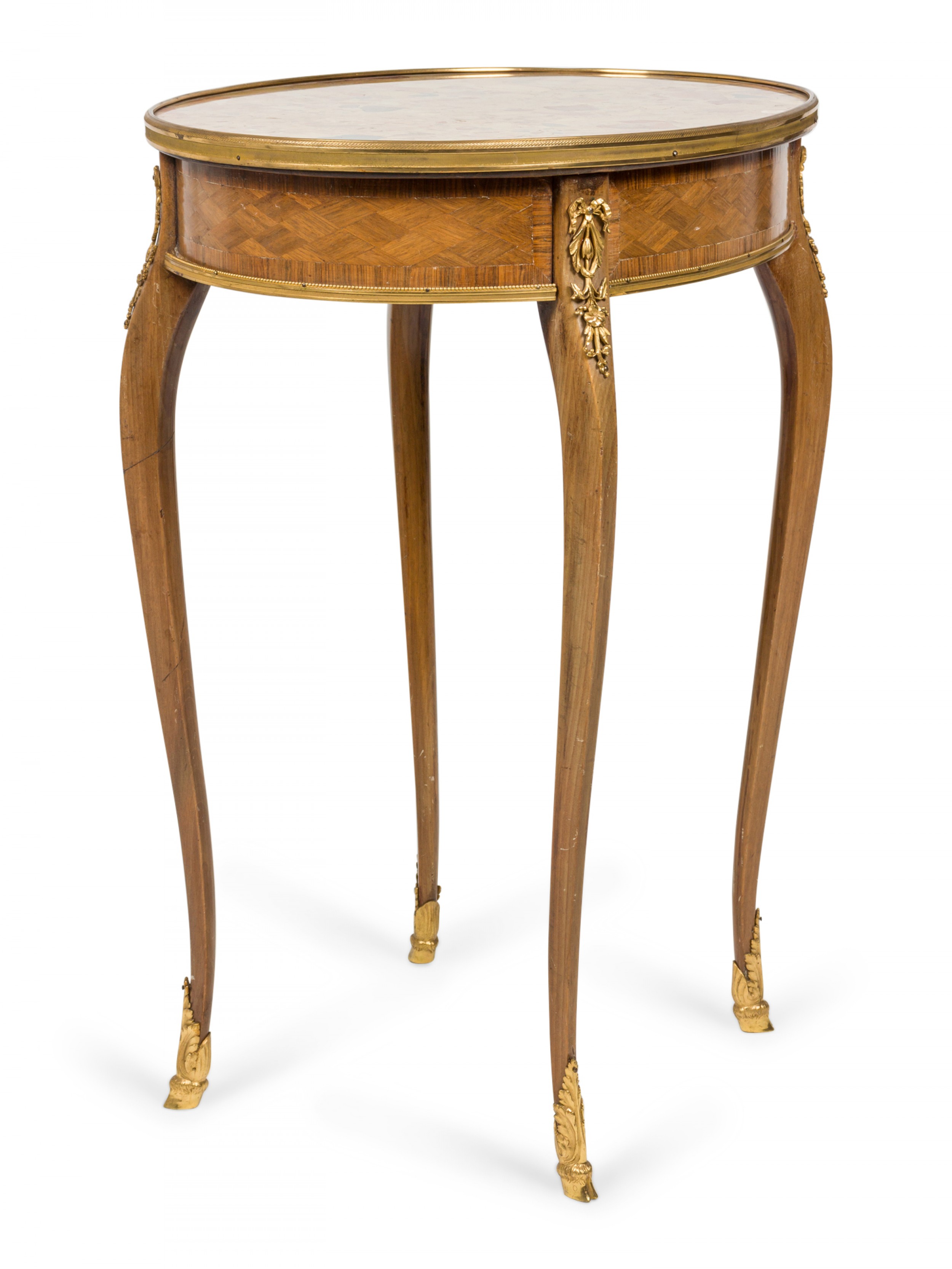 French Louis XV-style (19th Century) kingwood parquetry inlaid veneered oval end table with a drawer and gilt bronze trim with an inset marble top.