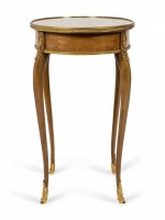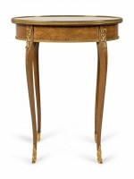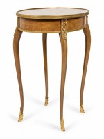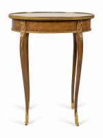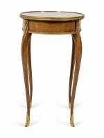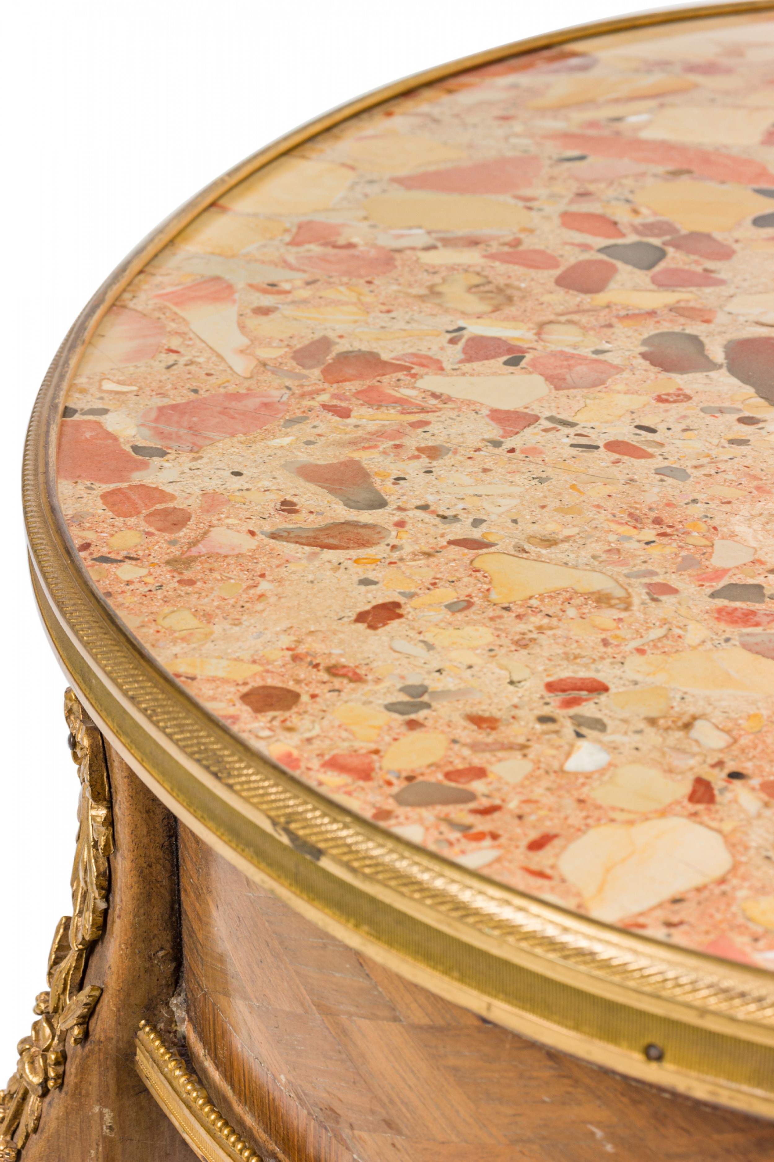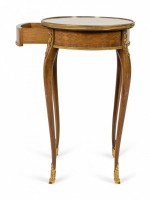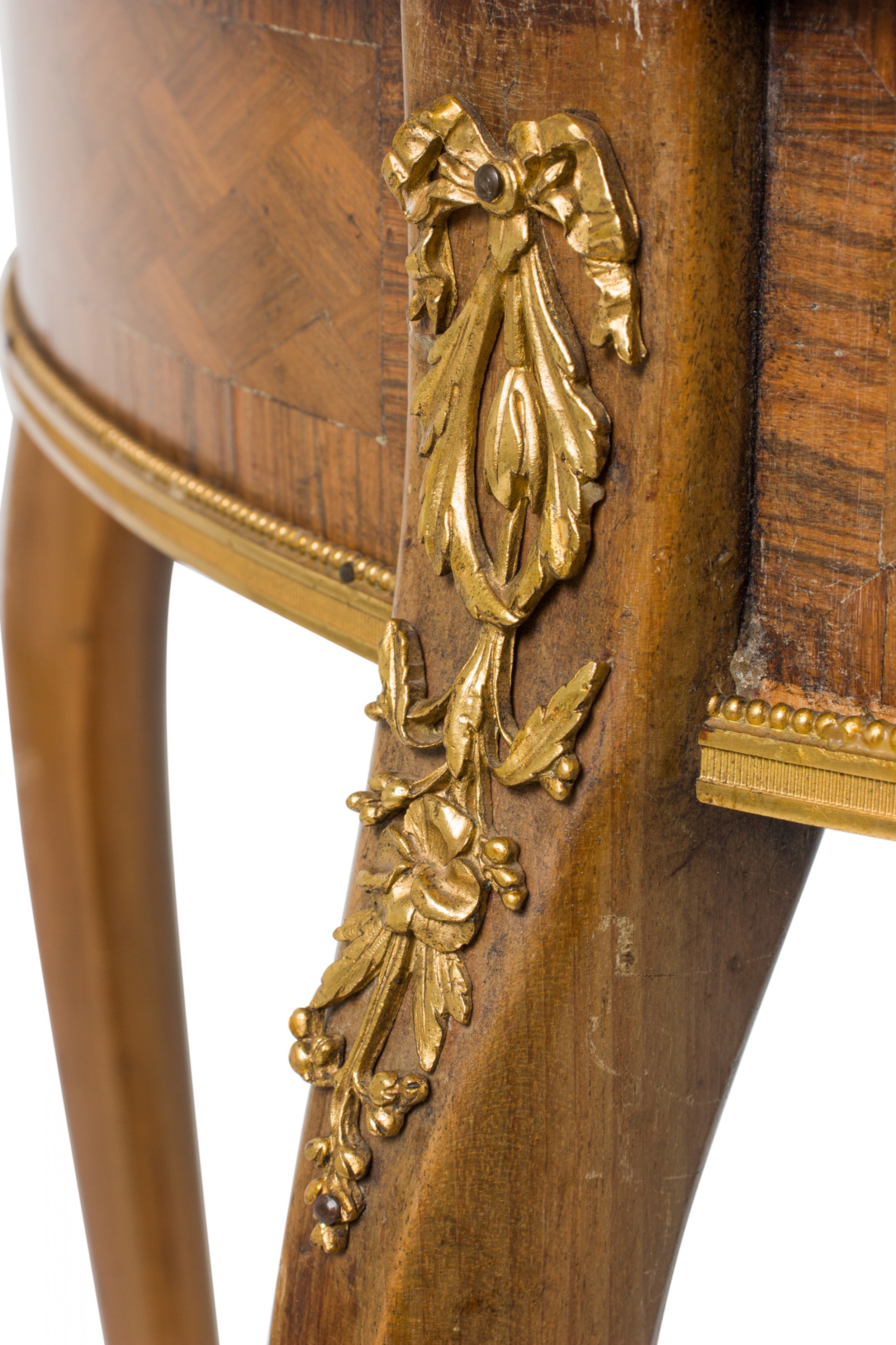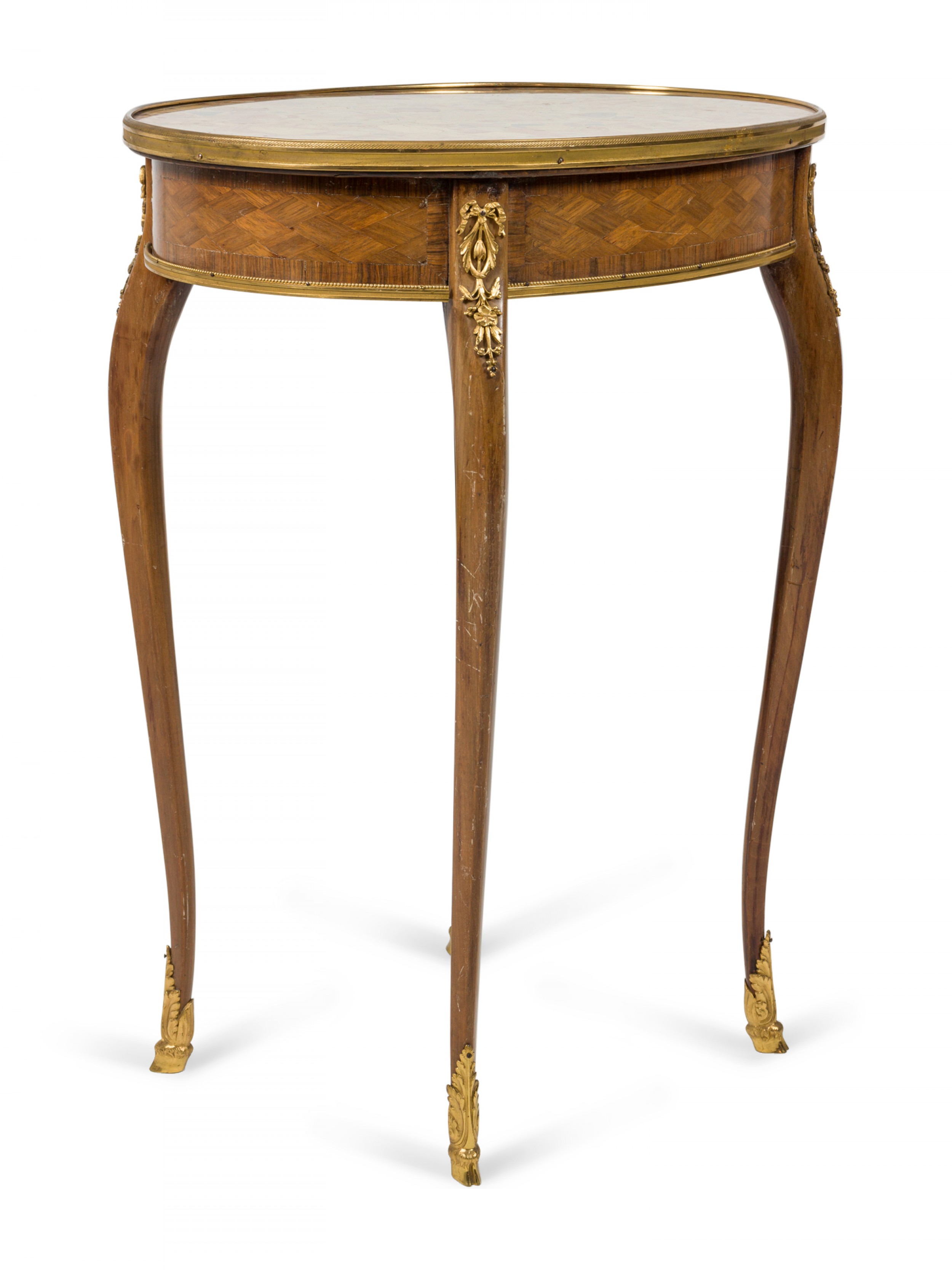French Louis XV-style (19th Century) kingwood parquetry inlaid veneered oval end table with a drawer and gilt bronze trim with an inset marble top.