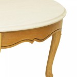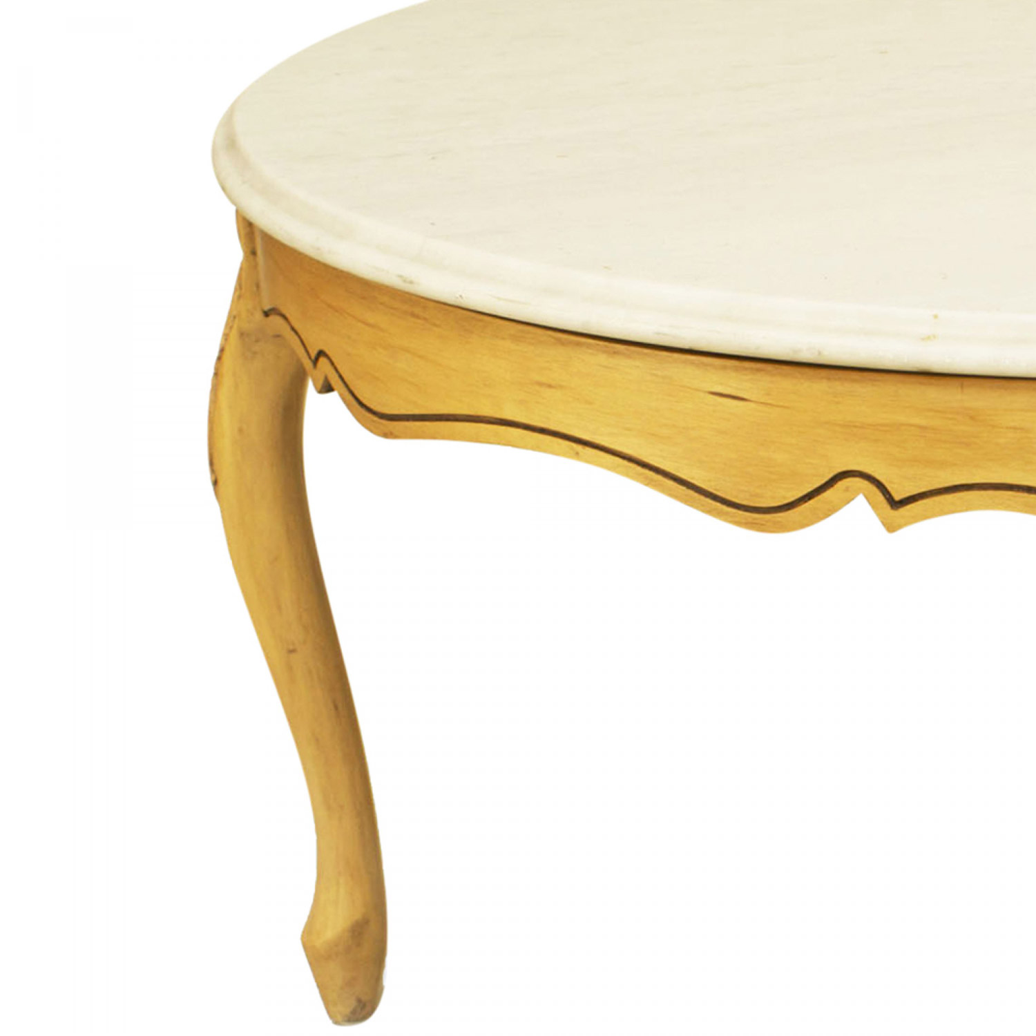 French Louis XV-style (20th Century) stripped wood base coffee table with carved legs and a round white marble top..