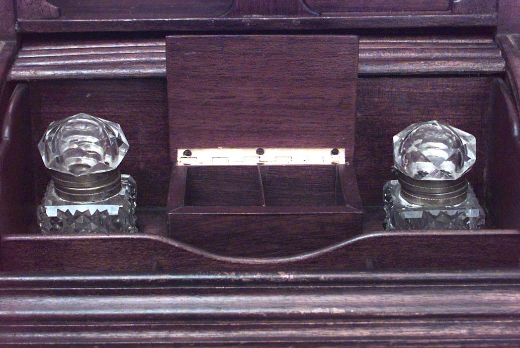 French Louis XV-style (19th Century) inkwell stand in the form of a miniature secretary with roll top and etched glass doors..