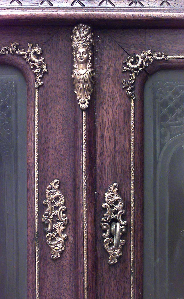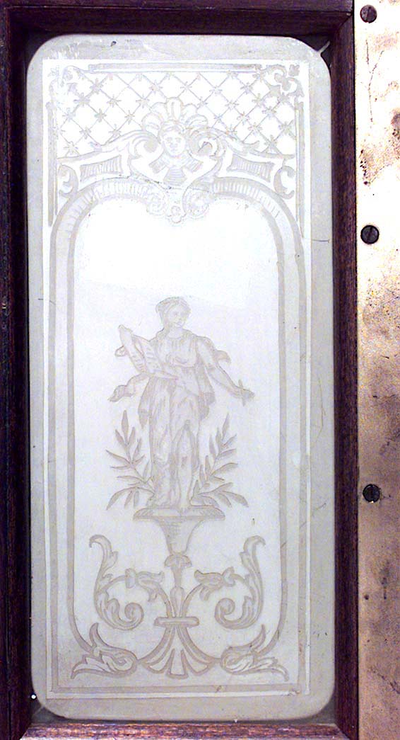Style: French Materials & Techniques: Etched, glass, walnut Category: Office/Library, Accessories/Décor/Bric-a-Brac Condition: Roll top is stiff and hard to open.