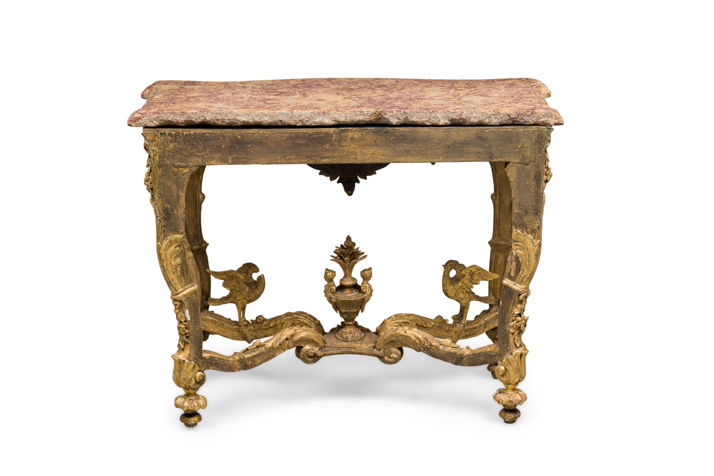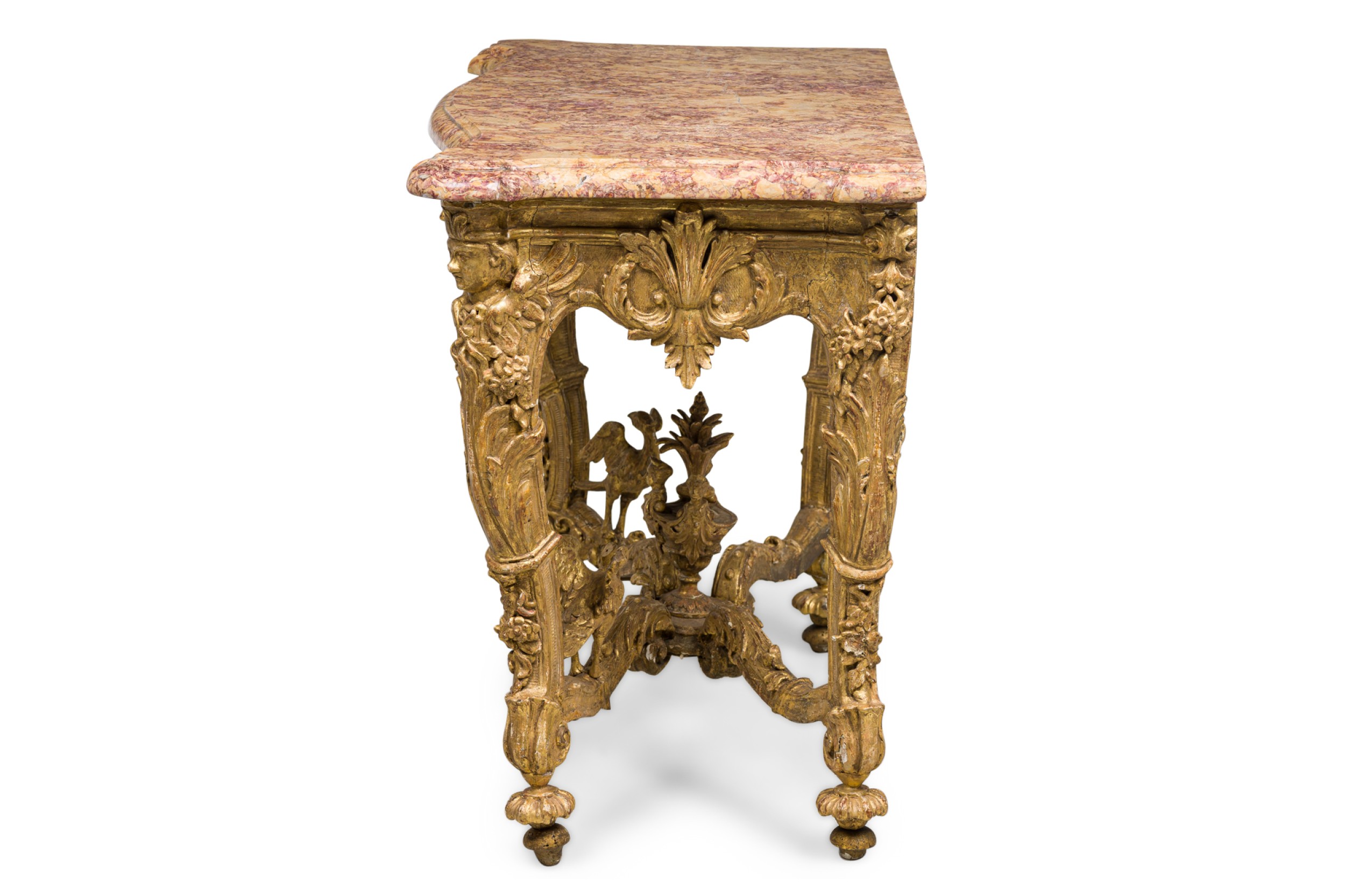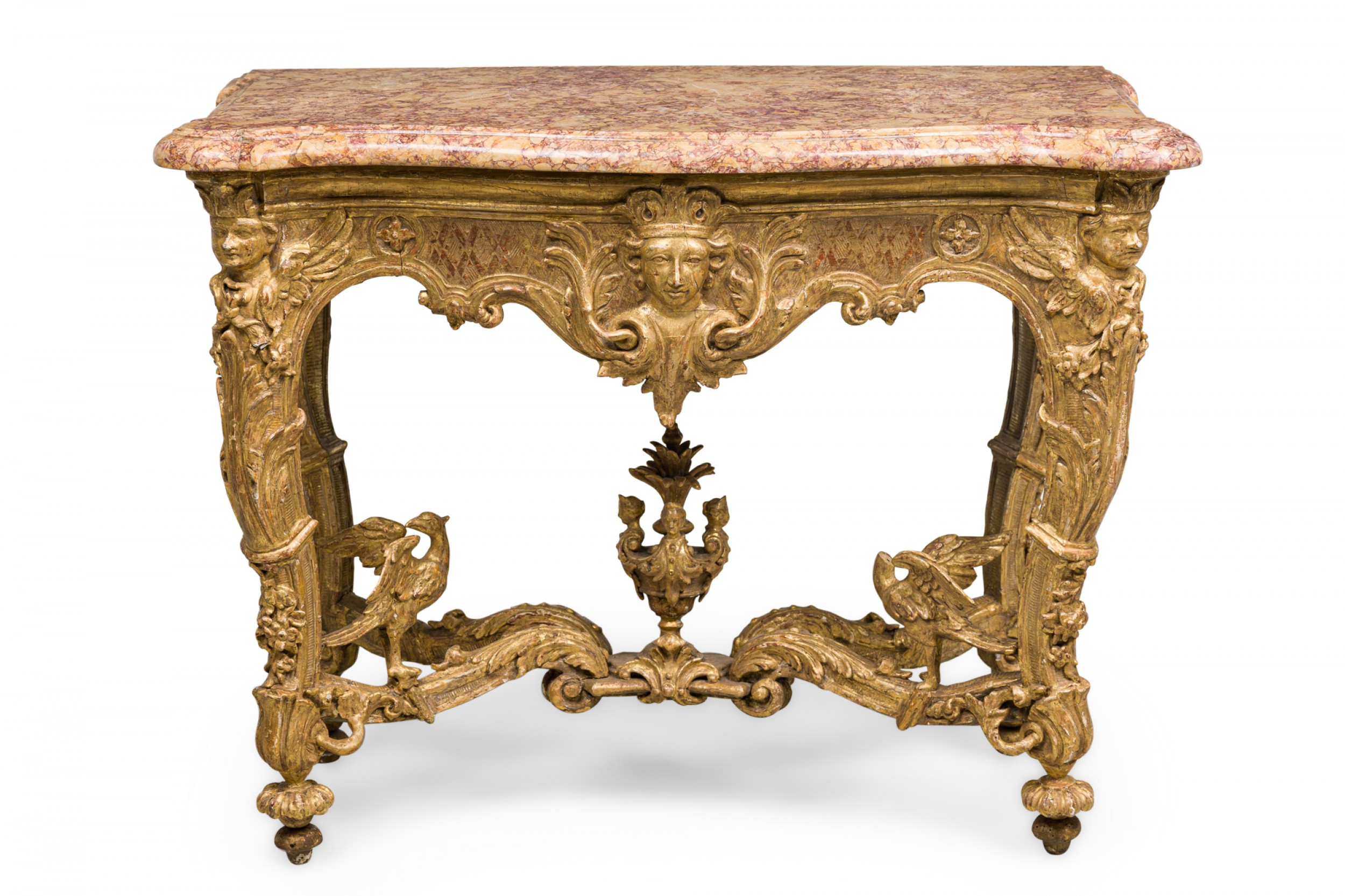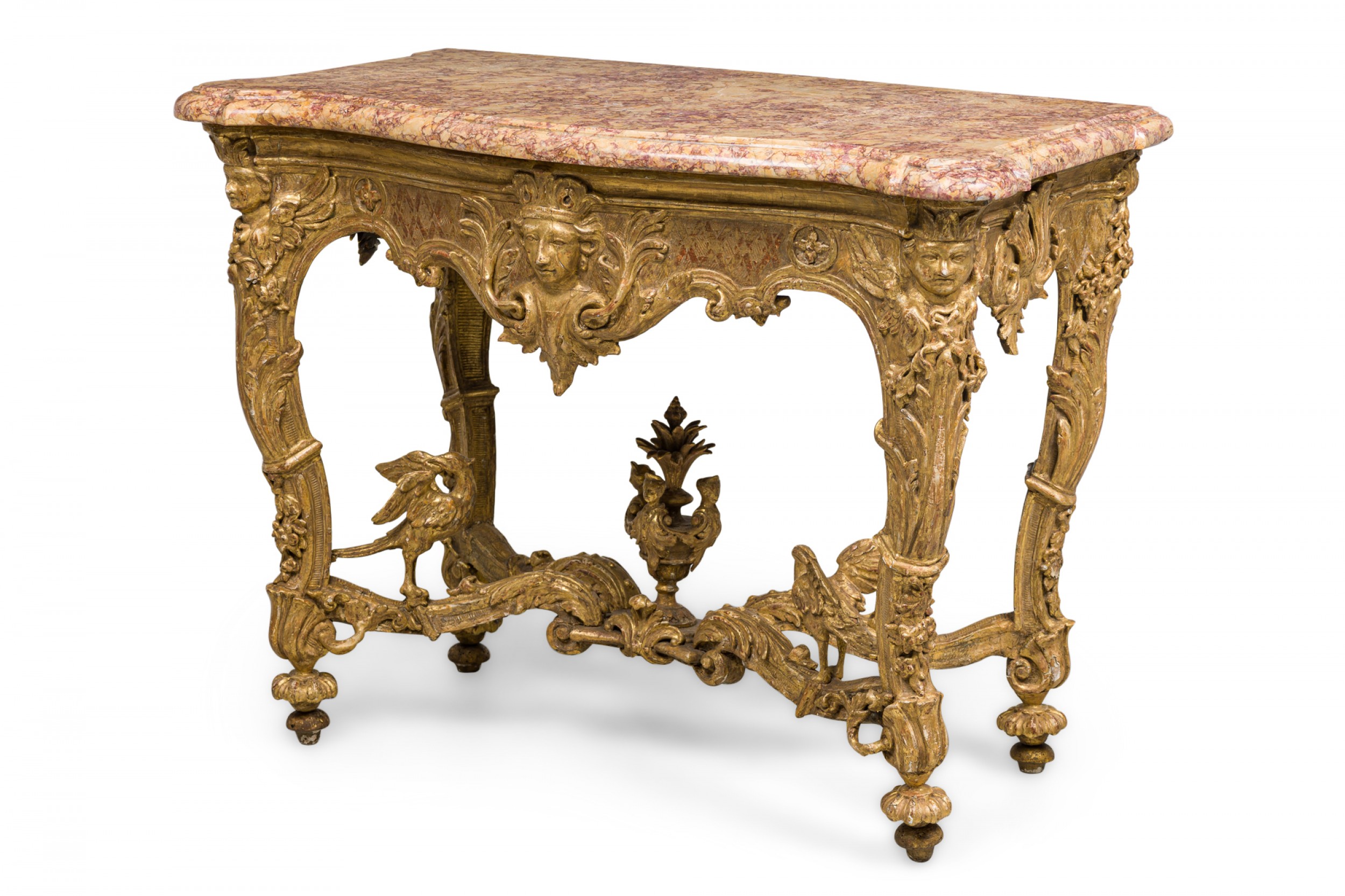 French Louis XV console table with an ornately carved giltwood base with figural designs and topped with a shaped beige, yellow, and blush marble top.