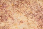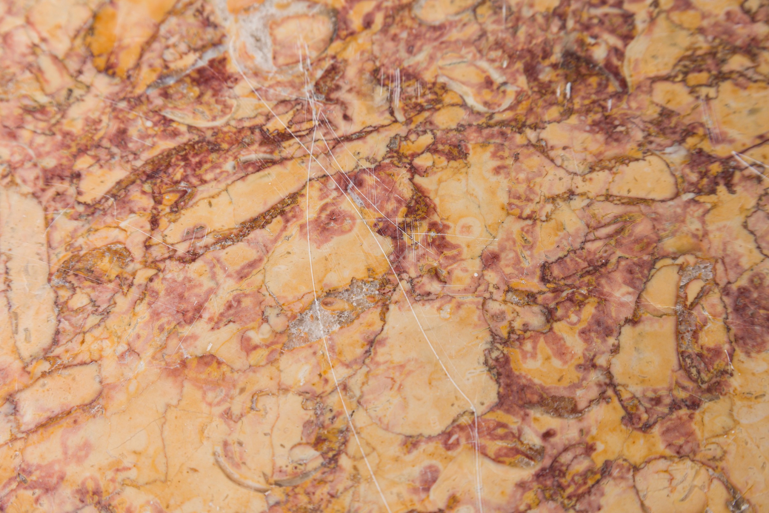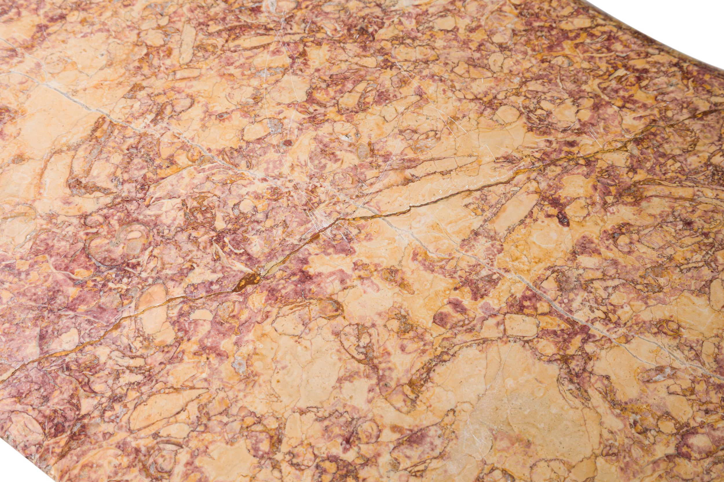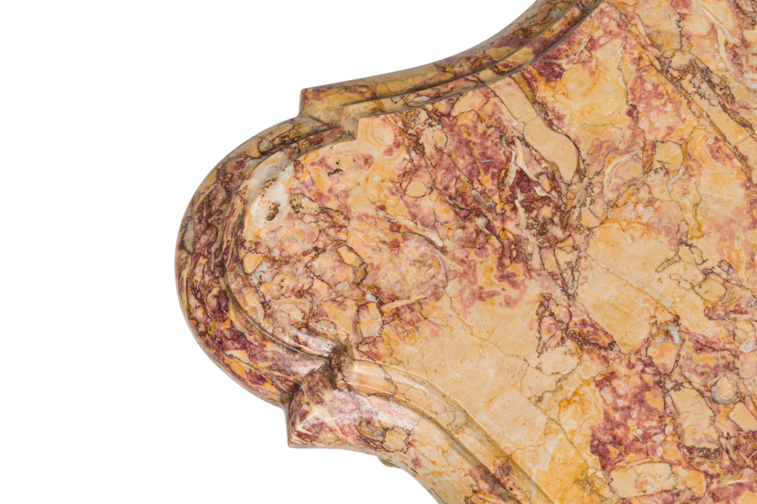 French Louis XV console table with an ornately carved giltwood base with figural designs and topped with a shaped beige, yellow, and blush marble top.
