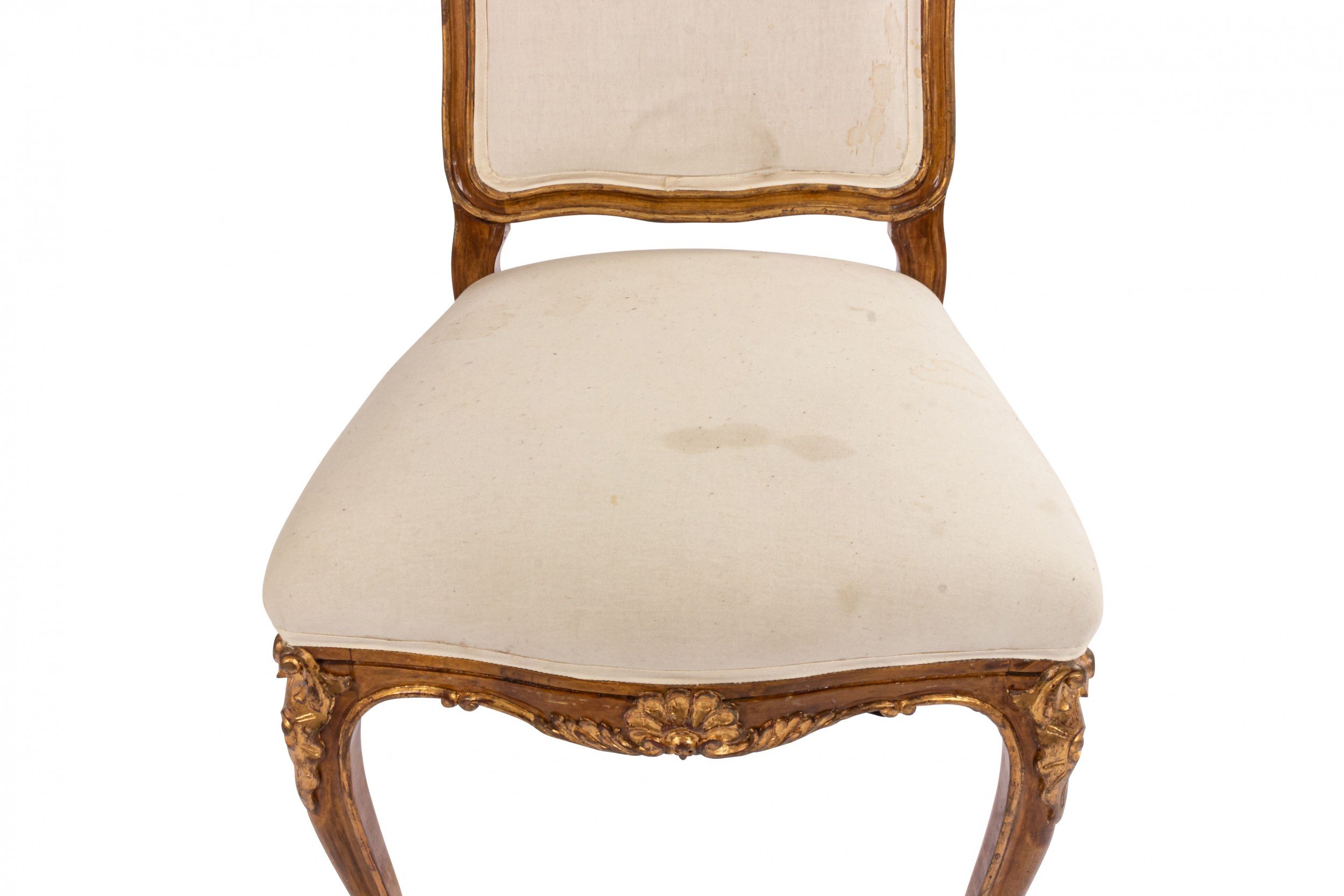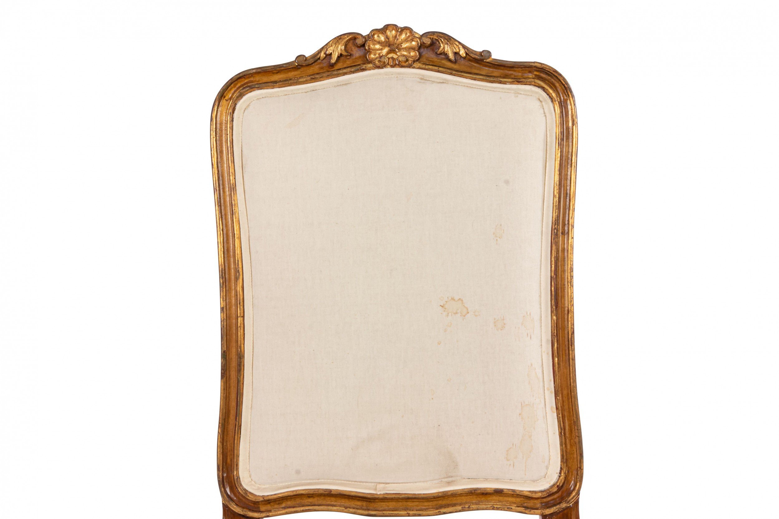 Style: French Materials & Techniques: Carved, crest, gold, painted, walnut Category: Seating, Office/Library, Dining Room Condition: Antique condition. White upholstery has faint yet visible staining.