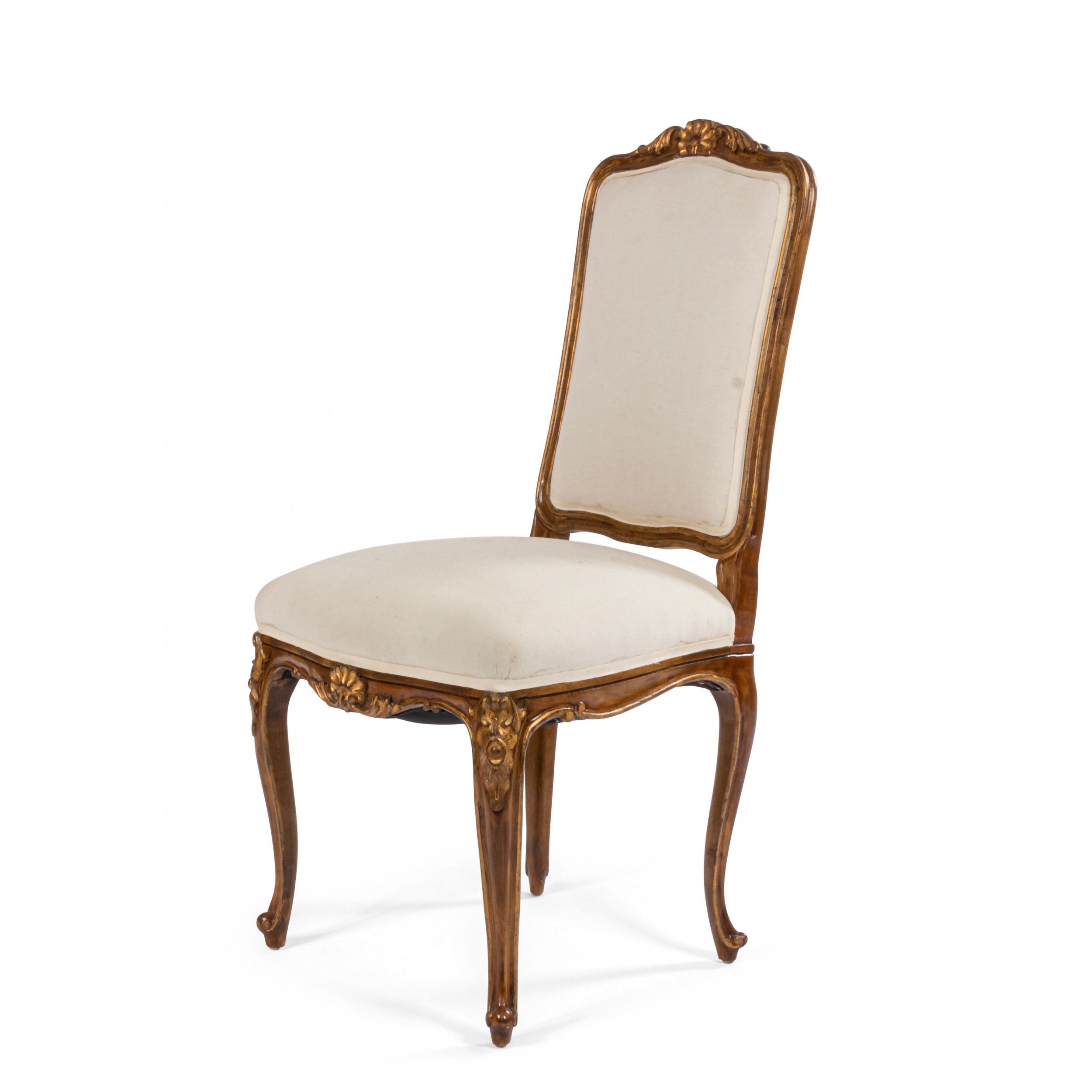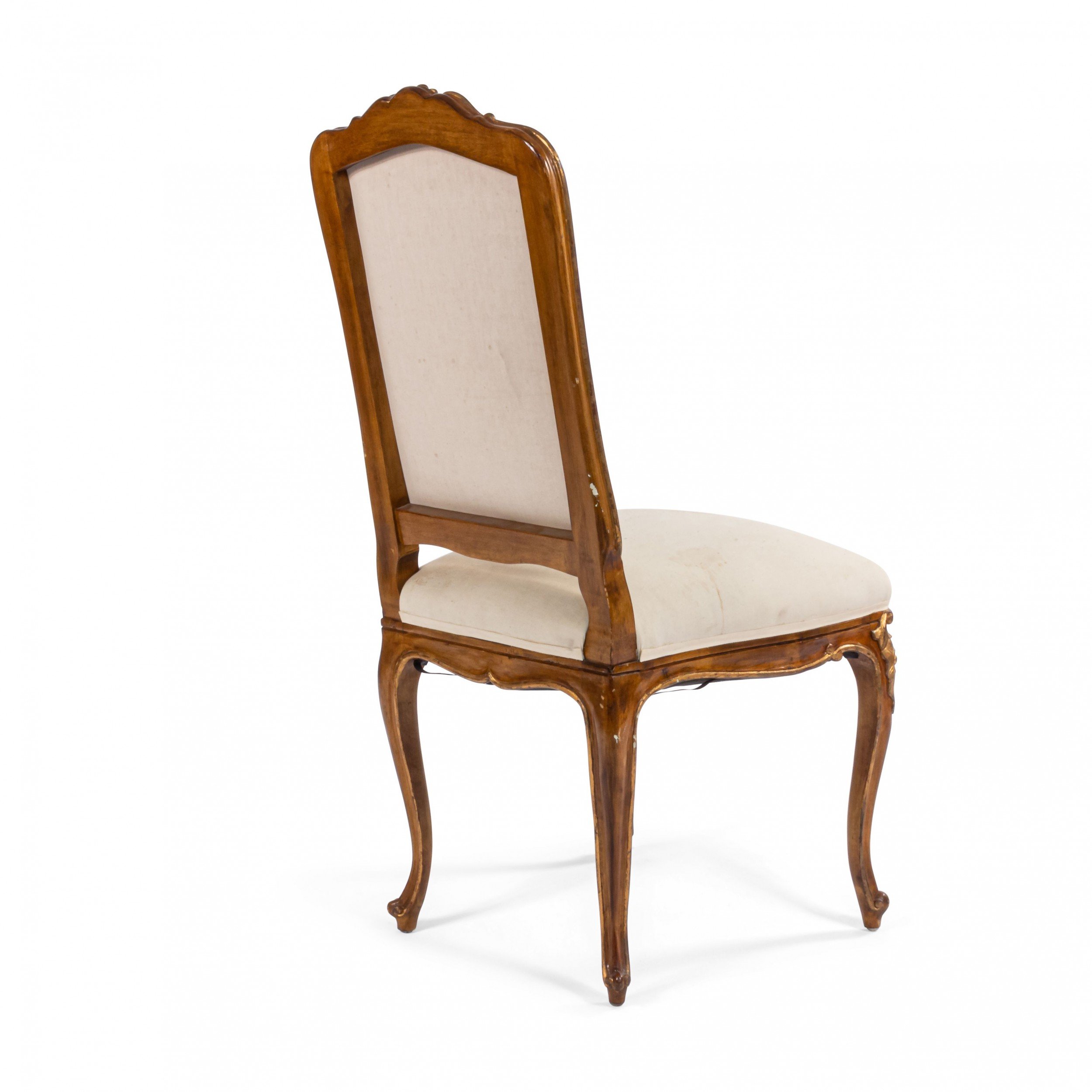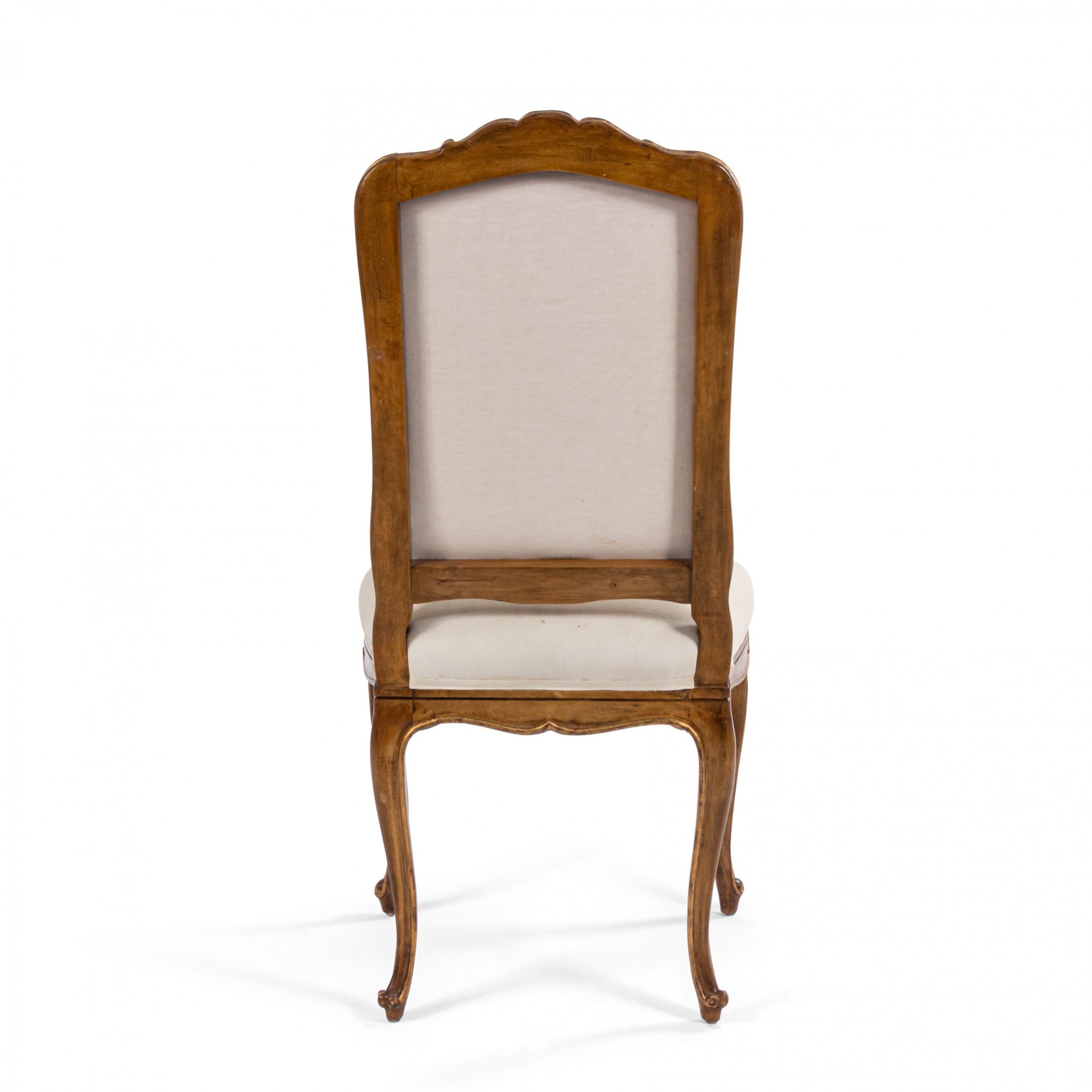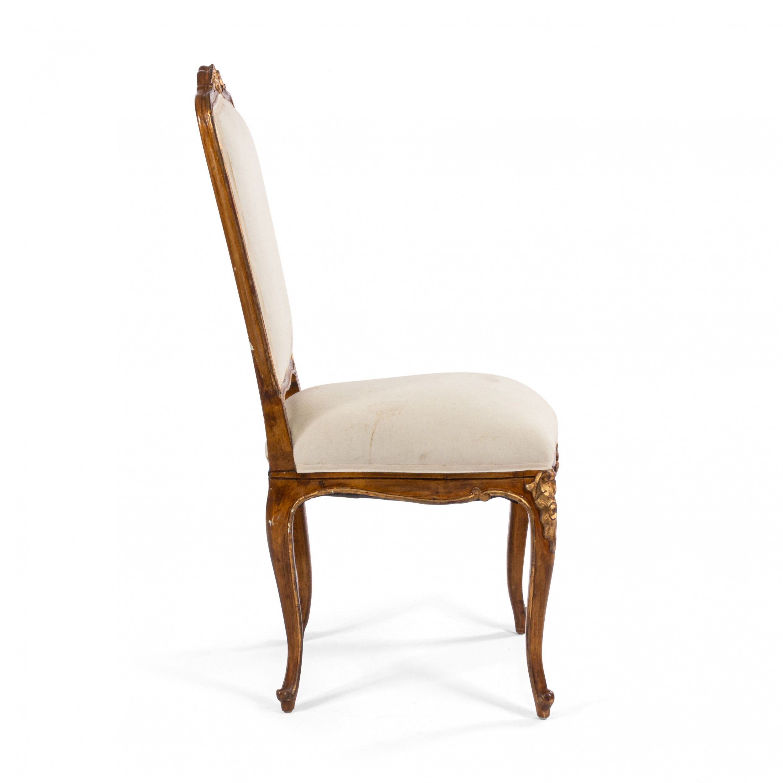 SET of 6 French Louis XV style (19/20th Cent) walnut and gold painted high back side chairs with shell carved back crest and white upholstered seat and back..