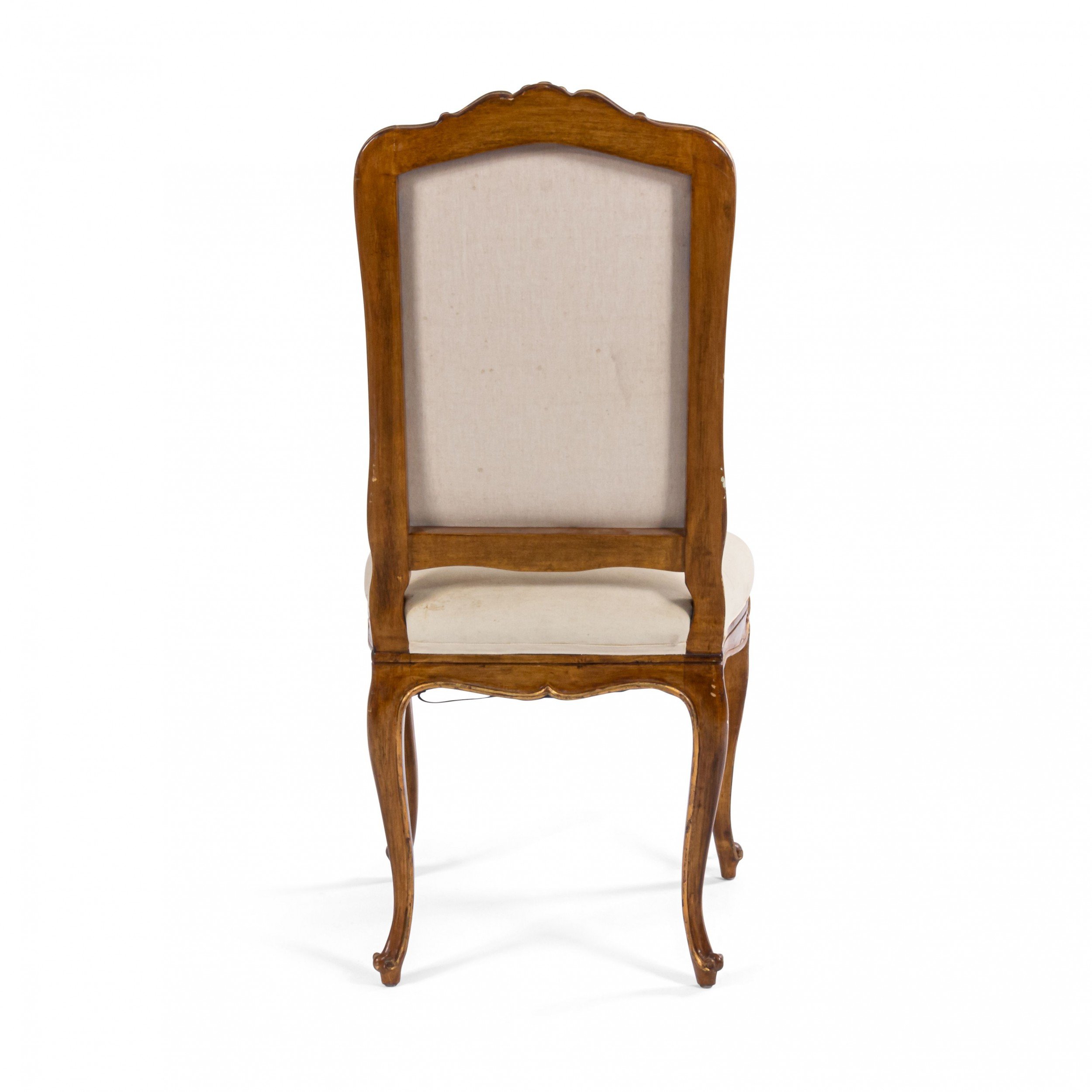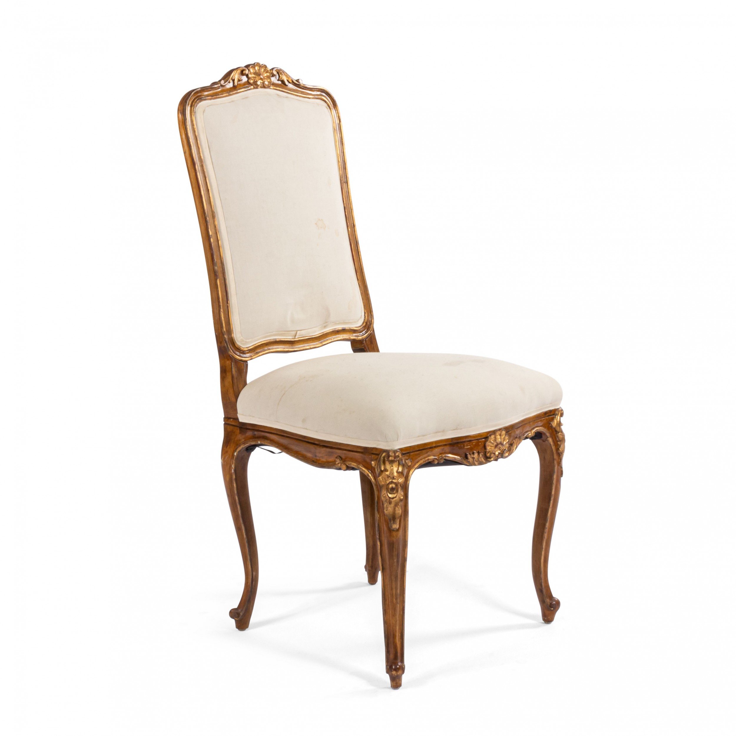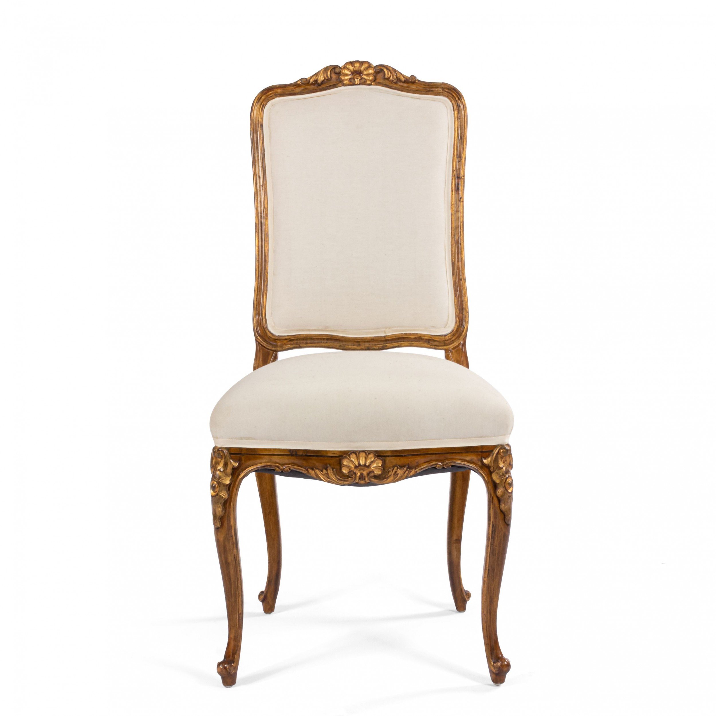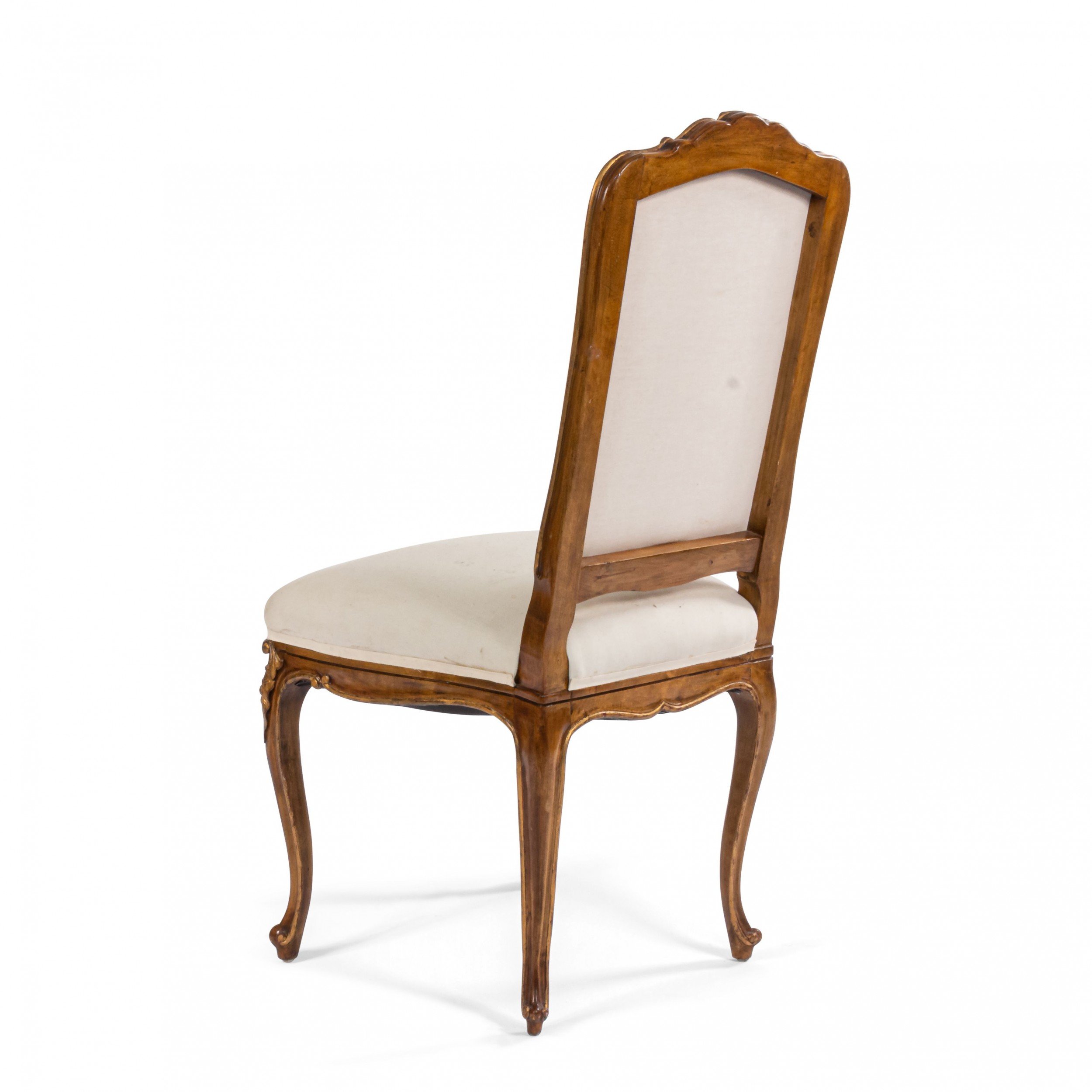 SET of 6 French Louis XV style (19/20th Cent) walnut and gold painted high back side chairs with shell carved back crest and white upholstered seat and back..