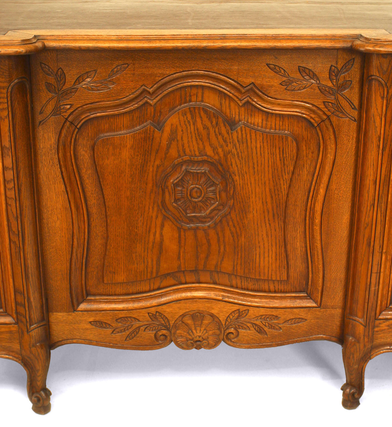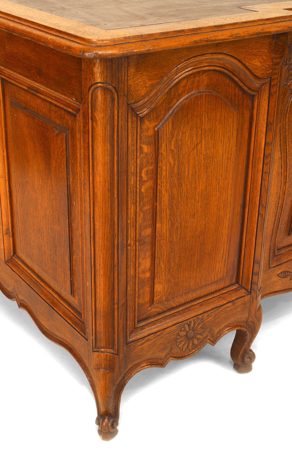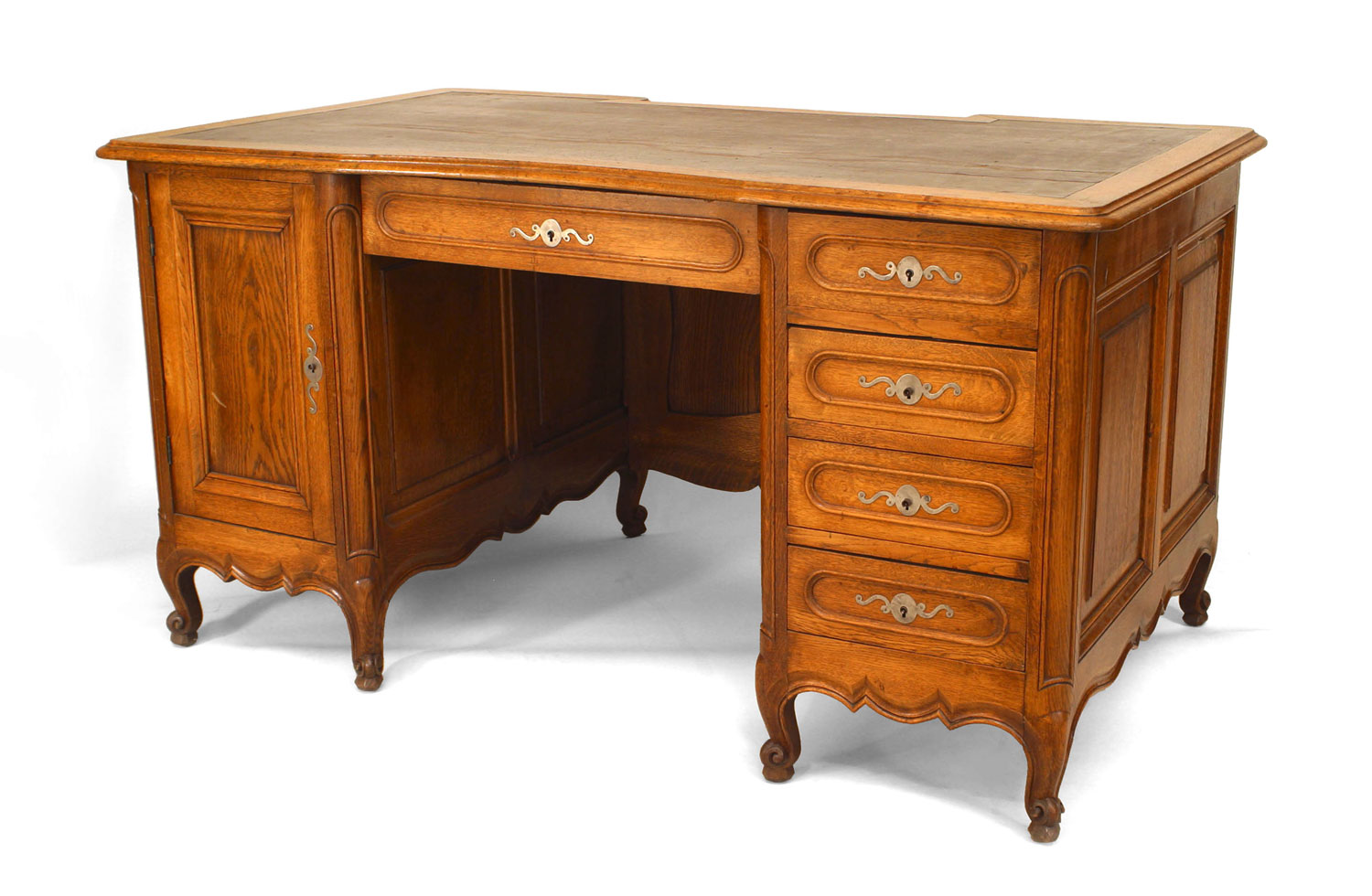 French Louis XV style (19th Century) provincial oak kneehole desk with brown leather top..