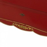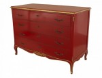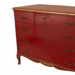 French Louis XV style (1940s) red lacquered chest having 3 drawers with gilt and bronze trim (stamped: JANSEN)