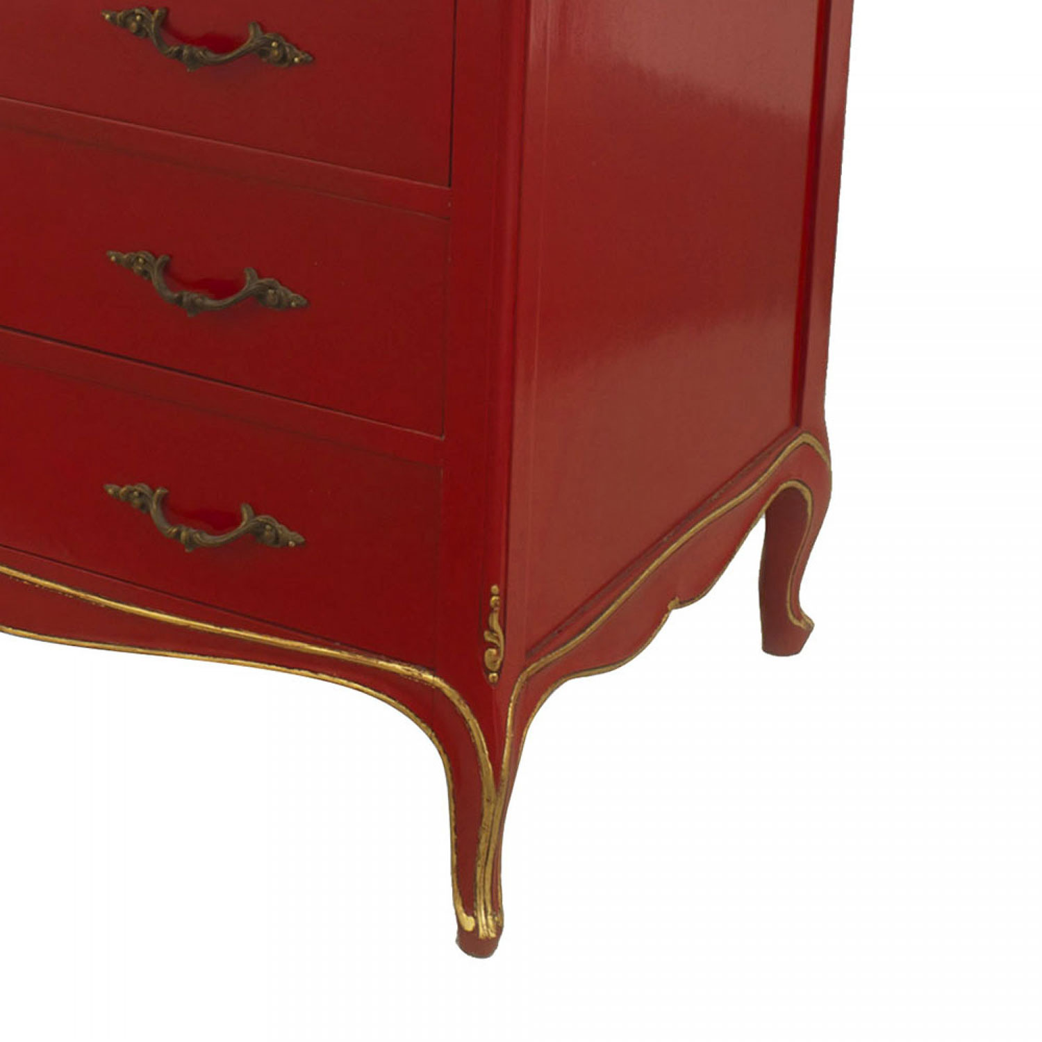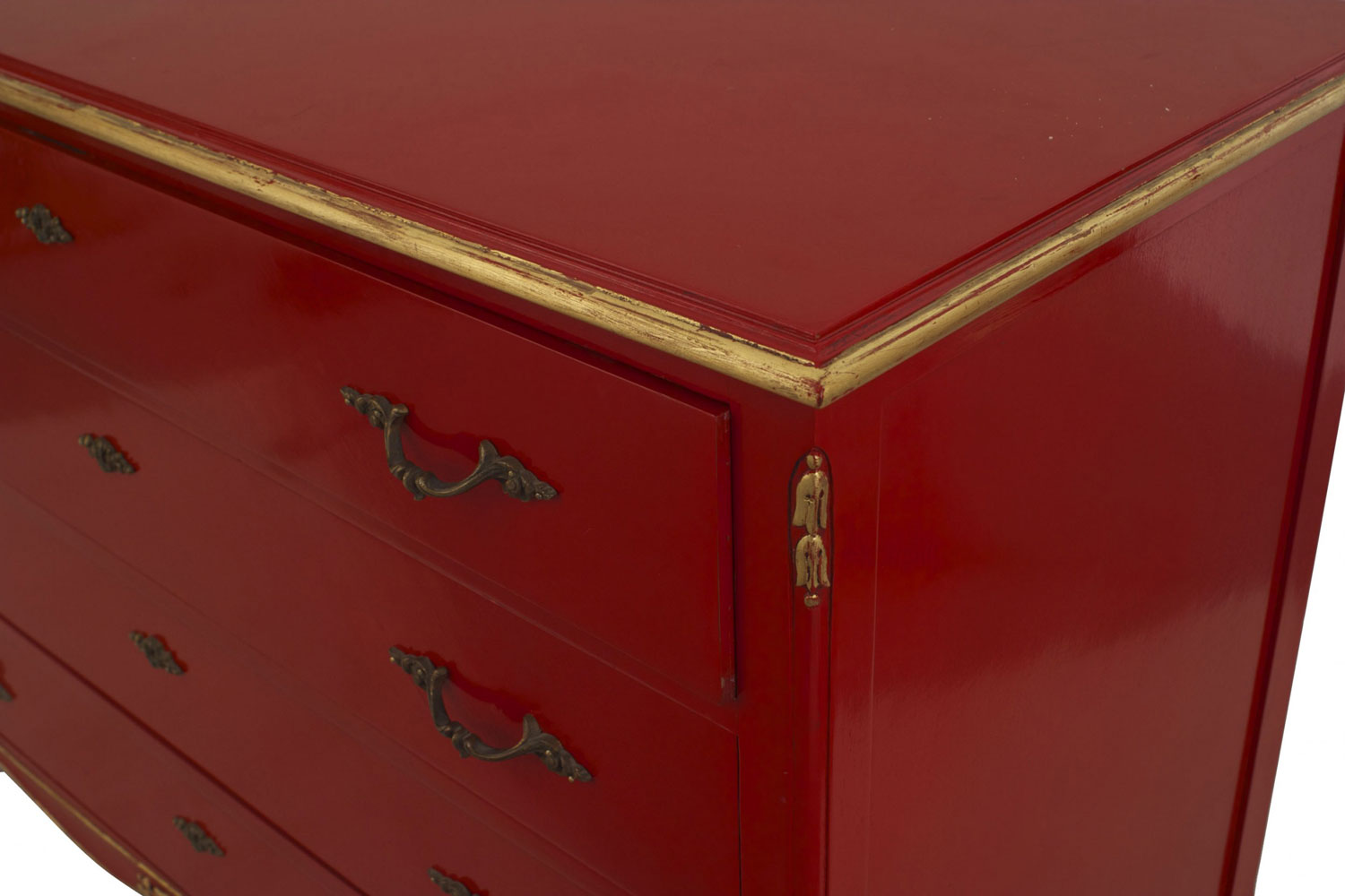 French Louis XV style (1940s) red lacquered chest having 3 drawers with gilt and bronze trim (stamped: JANSEN).