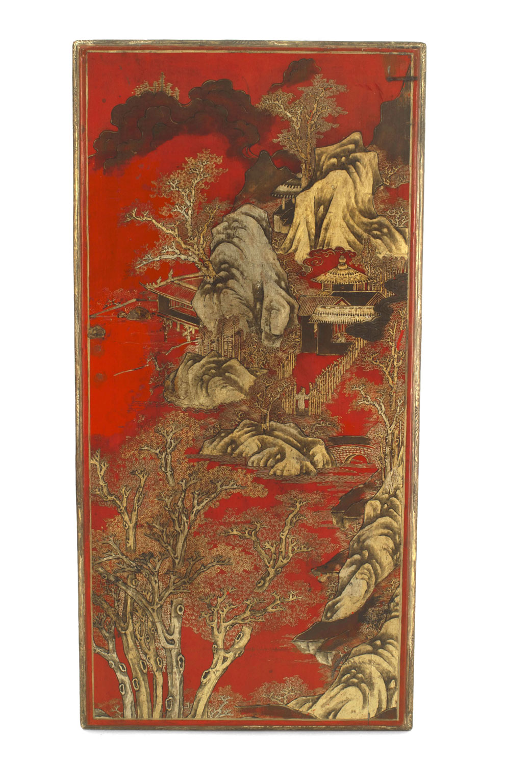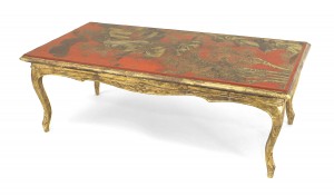 French Louis XV-style rectangular coffee table with a carved giltwood base under a red lacquered Chinoiserie decorated (19th Century) top.