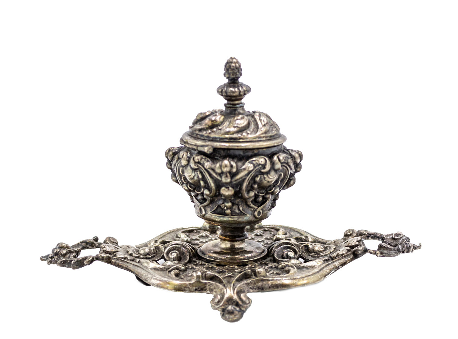 French Louis XV-style (19/20th Century) silver plate on bronze oval shaped inkwell with handles and acorn finial