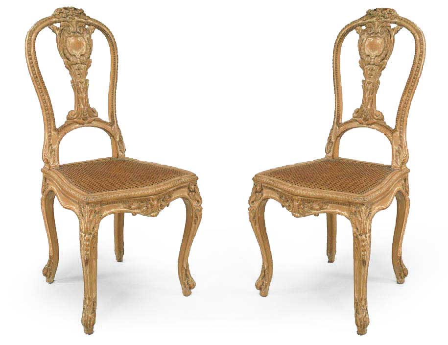 PAIR of French Louis XV style (19th Cent) stripped side chairs with carved splat back and cane seat