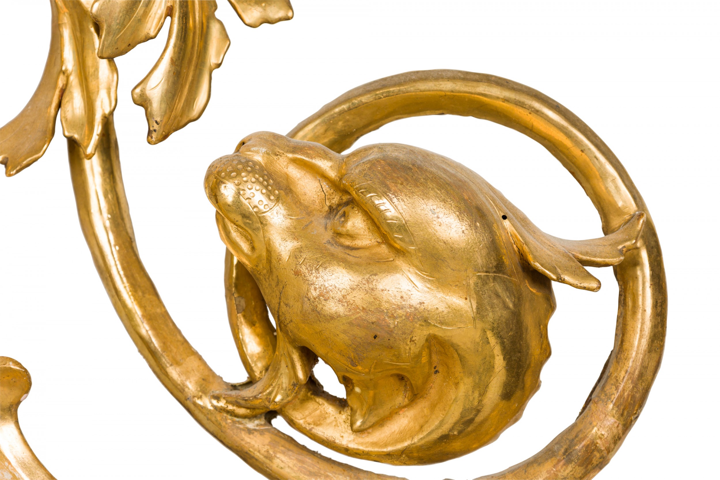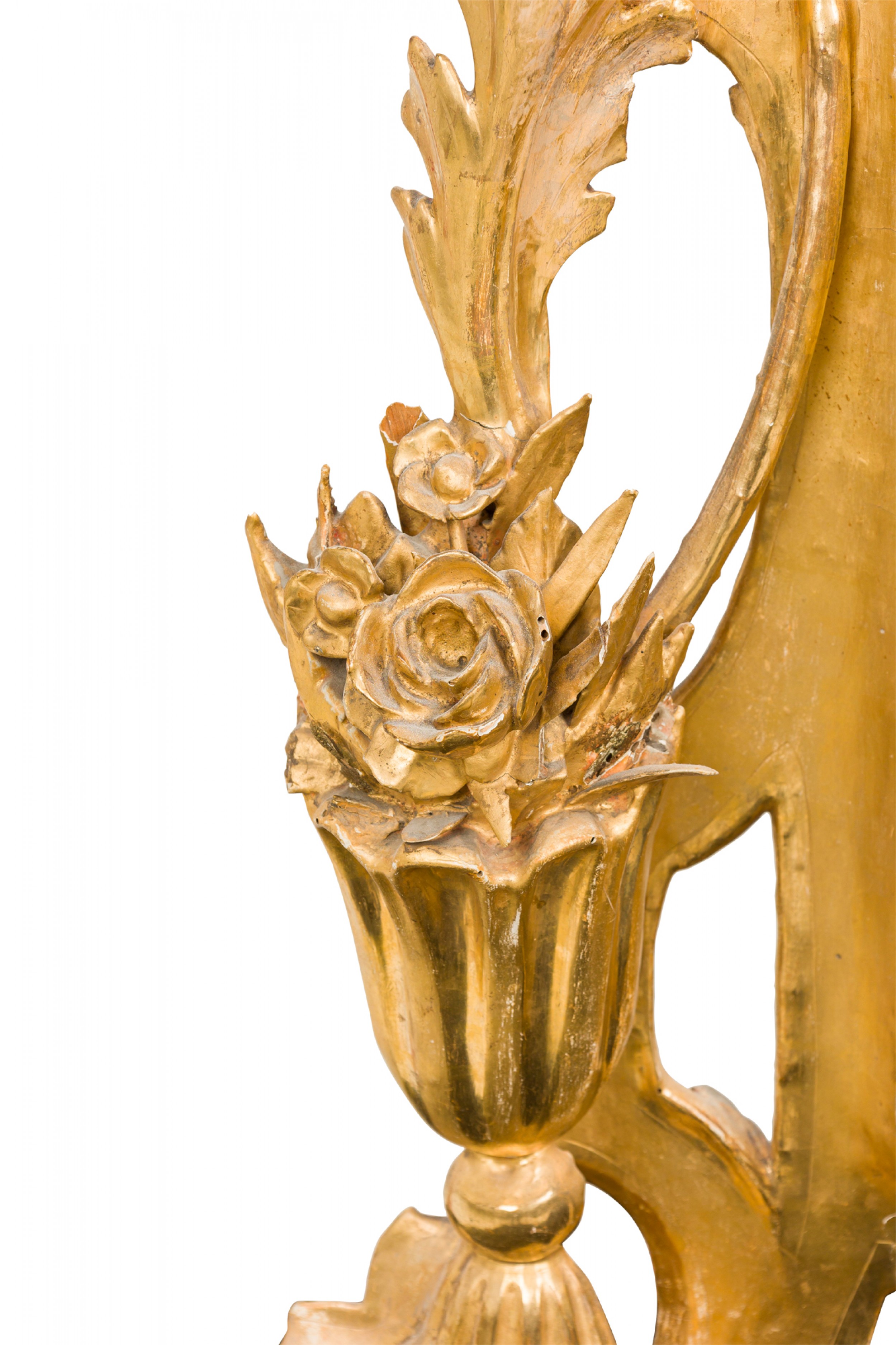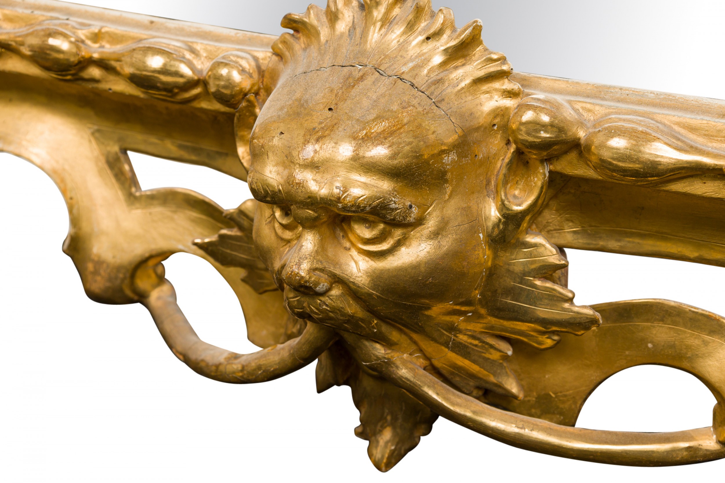 French Louis XV-style (19th Century) wall mirror with a giltwood filigree frame including scroll work designs intertwined with florals and animal heads, topped with a floral urn and scroll pediment..