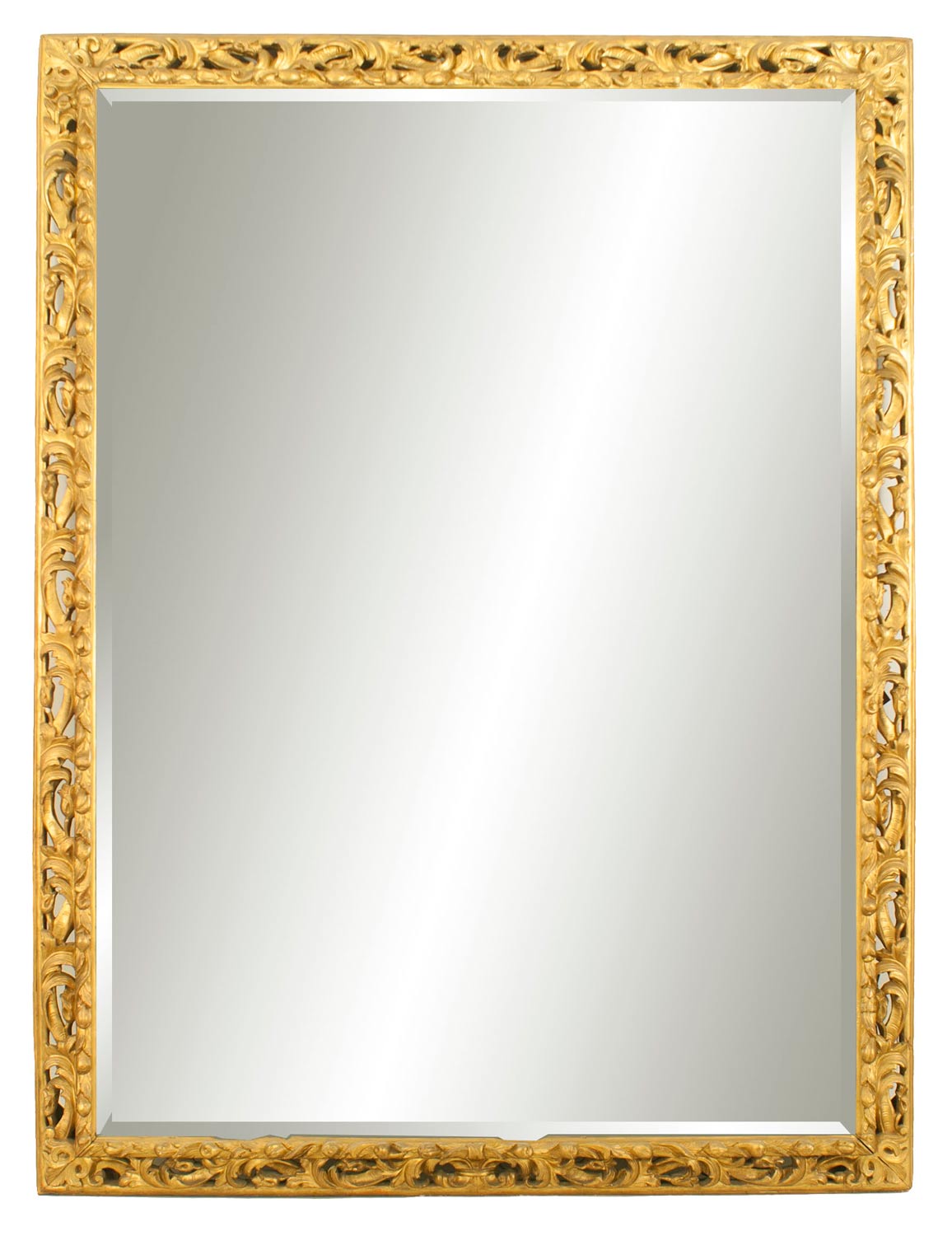 French Louis XV-style (19th Century) carved giltwood wall mirror with scrolling acanthus leaf and floral bud design and bevelled mirror. (metal tags on back stamped CHENUE)