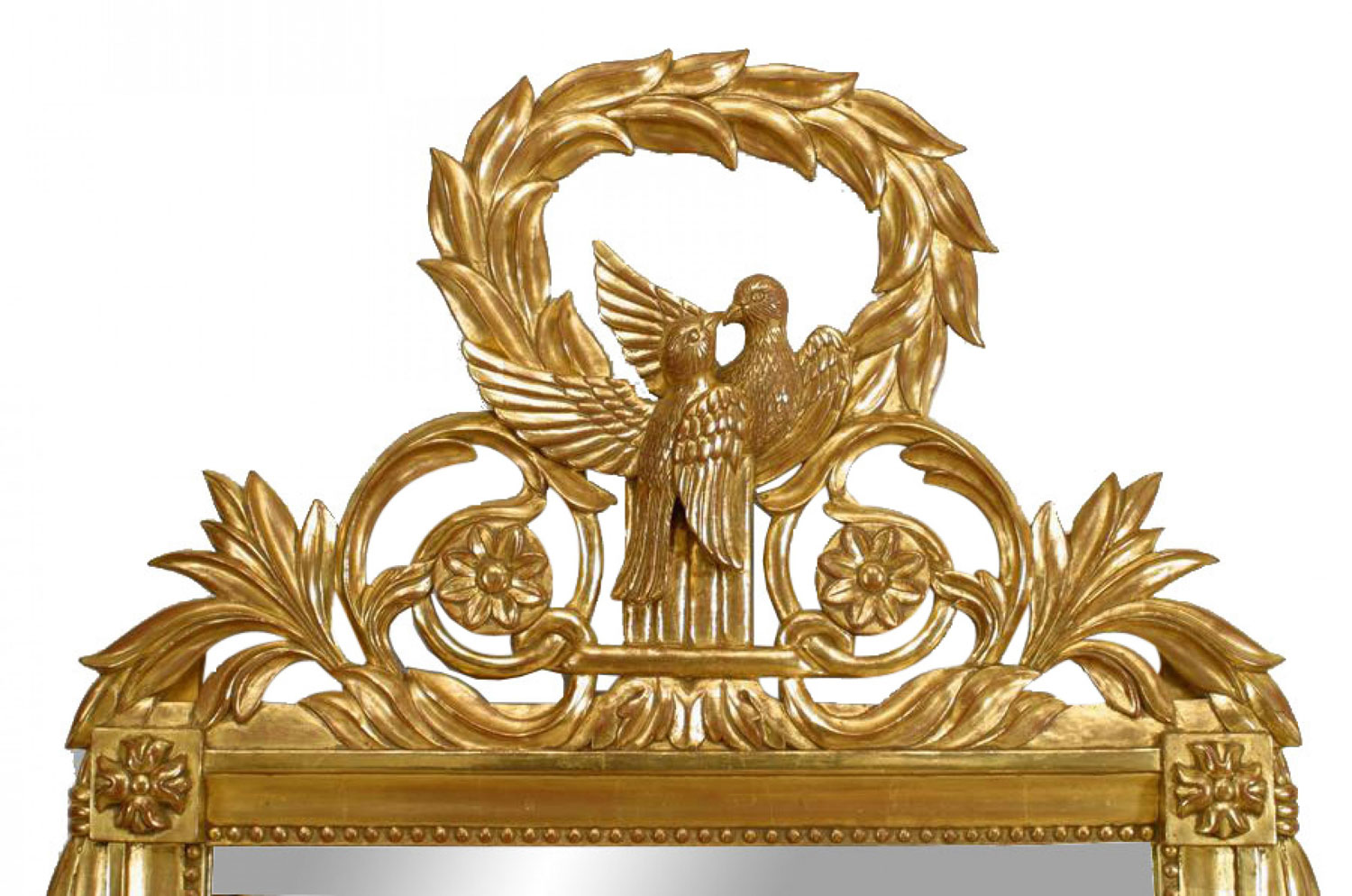 French Louis XV-style carved giltwood wall mirror with two carved kissing birds and wreath pediment top.