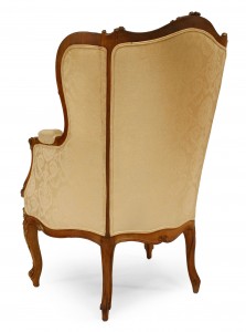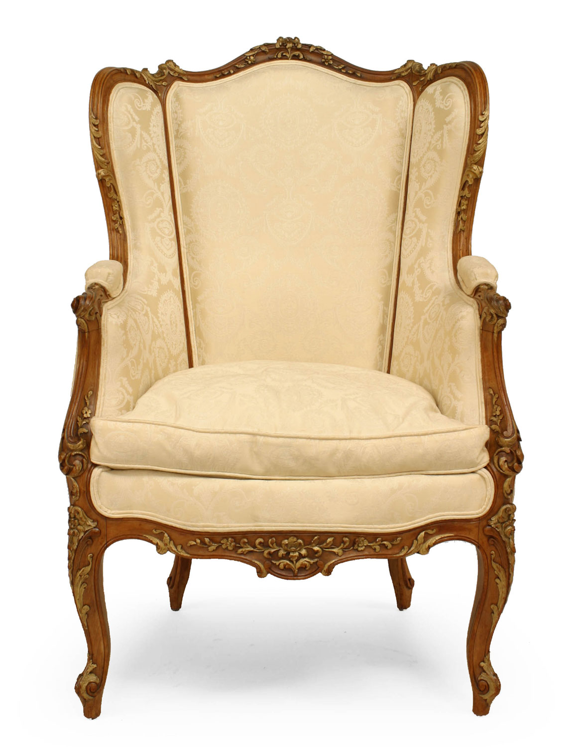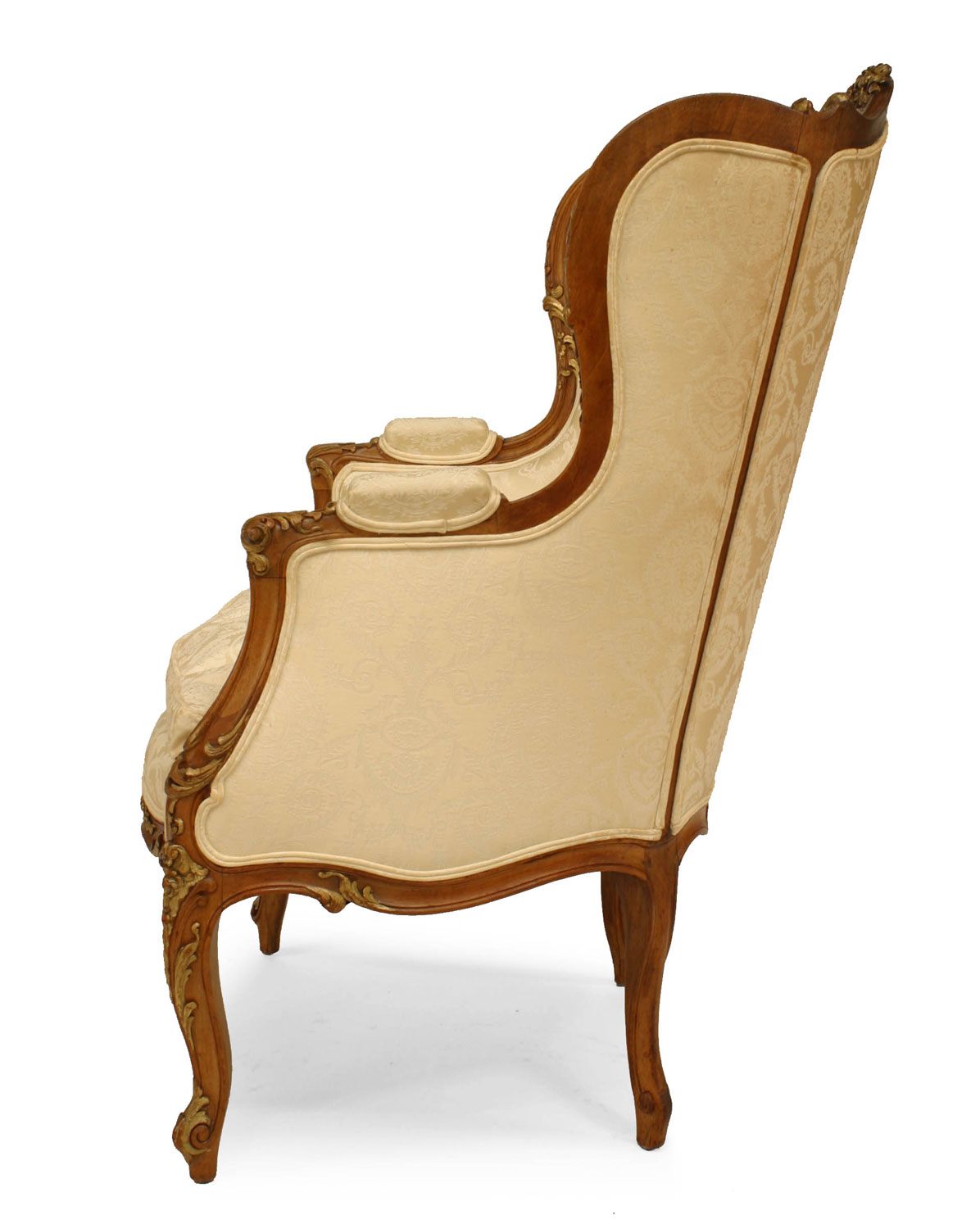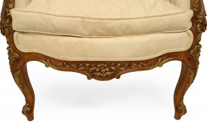 French Louis XV-style (19/20th Century) walnut bergere arm chair with gilt trim, white upholstery, and wing back