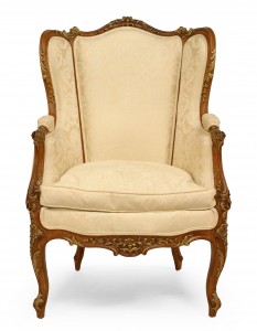 French Louis XV-style (19/20th Century) walnut bergere arm chair with gilt trim, white upholstery, and wing back.