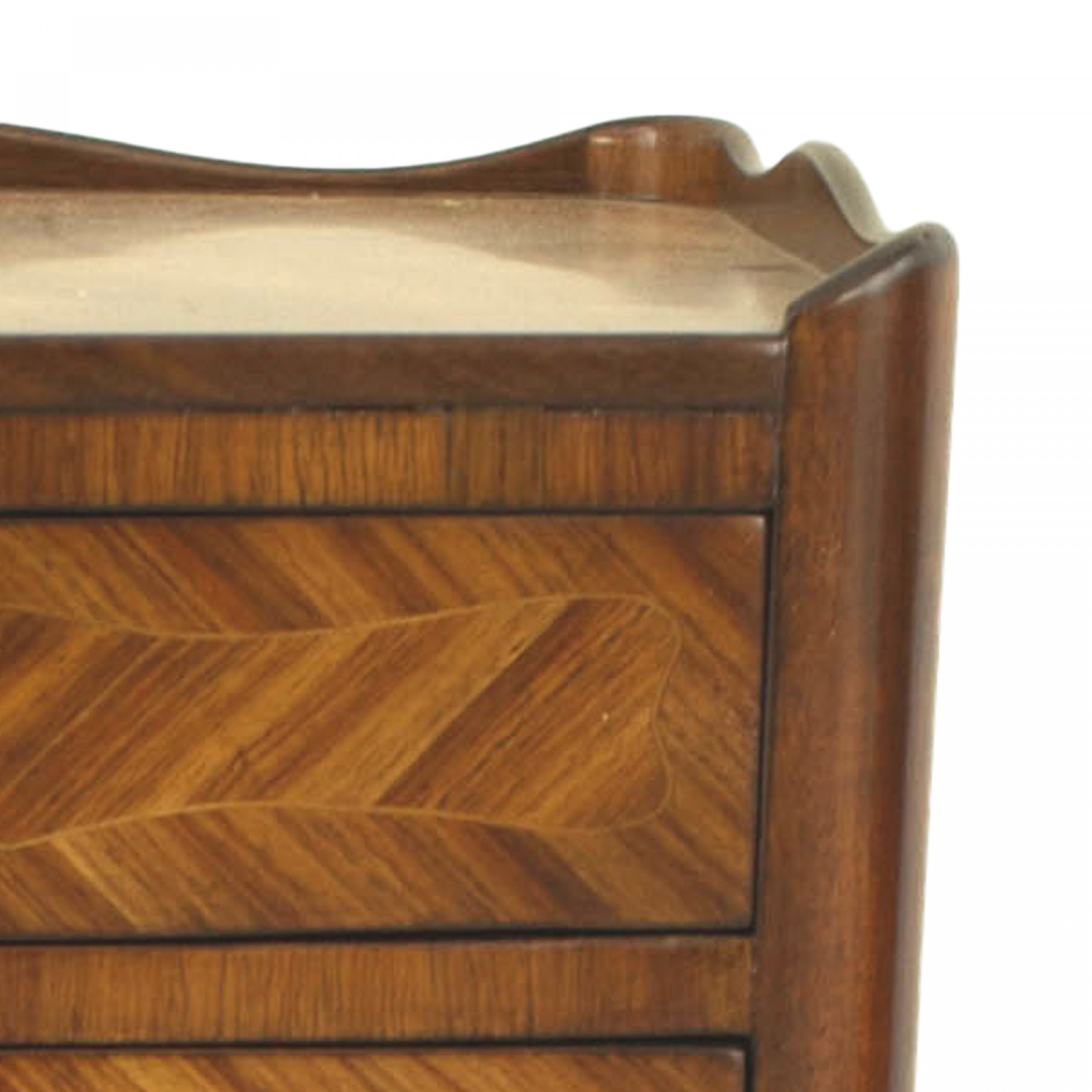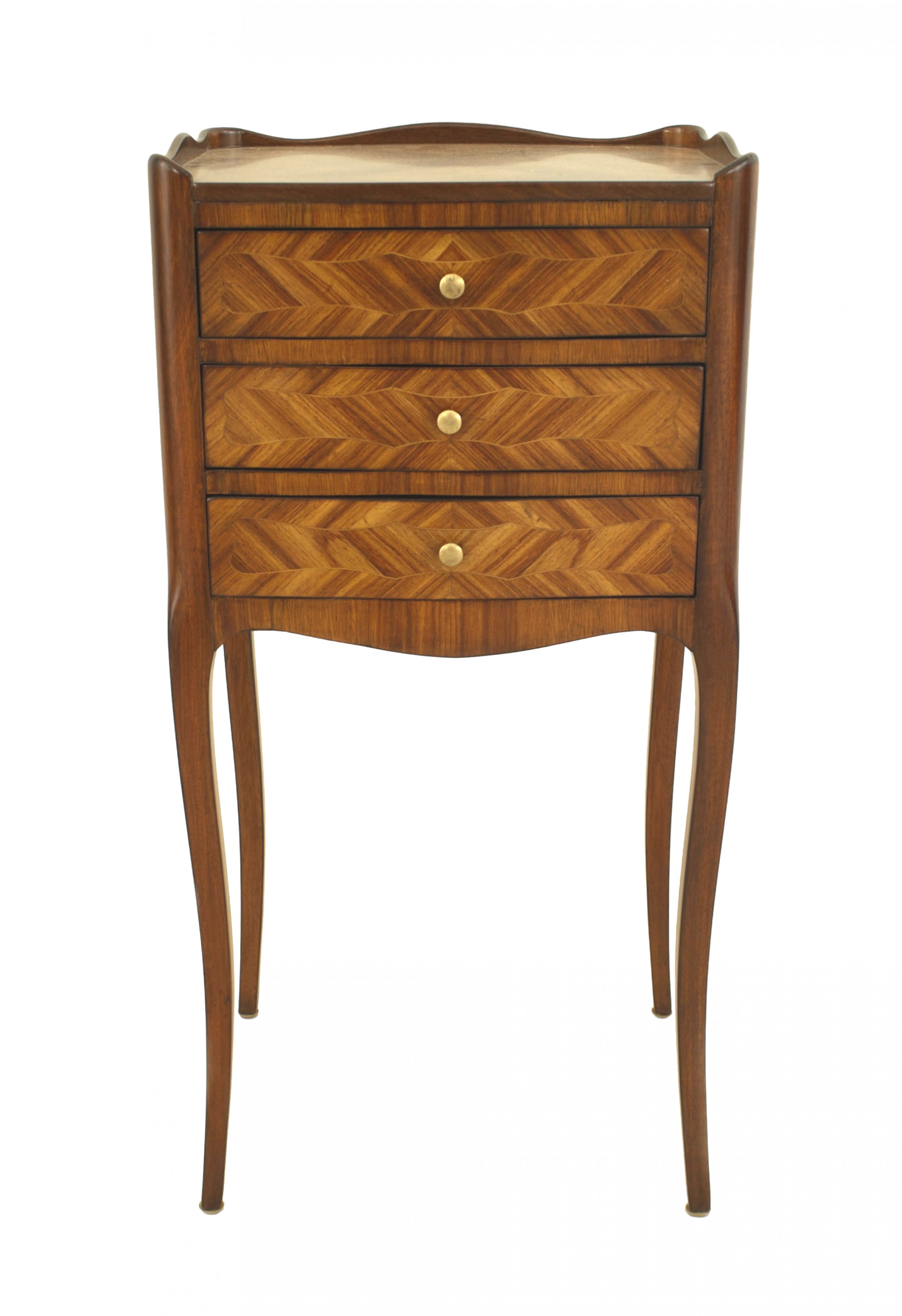 French Louis XV-style (19/20th Century) tulipwood veneered small bedside table / commode with three drawers, a gallery, and a floral marquetry top..