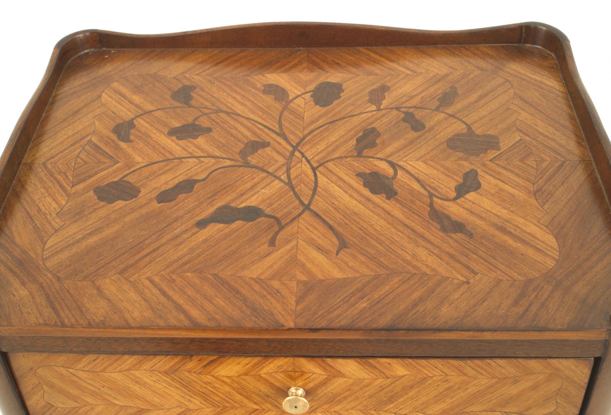 French Louis XV-style (19/20th Century) tulipwood veneered small bedside table / commode with three drawers, a gallery, and a floral marquetry top.