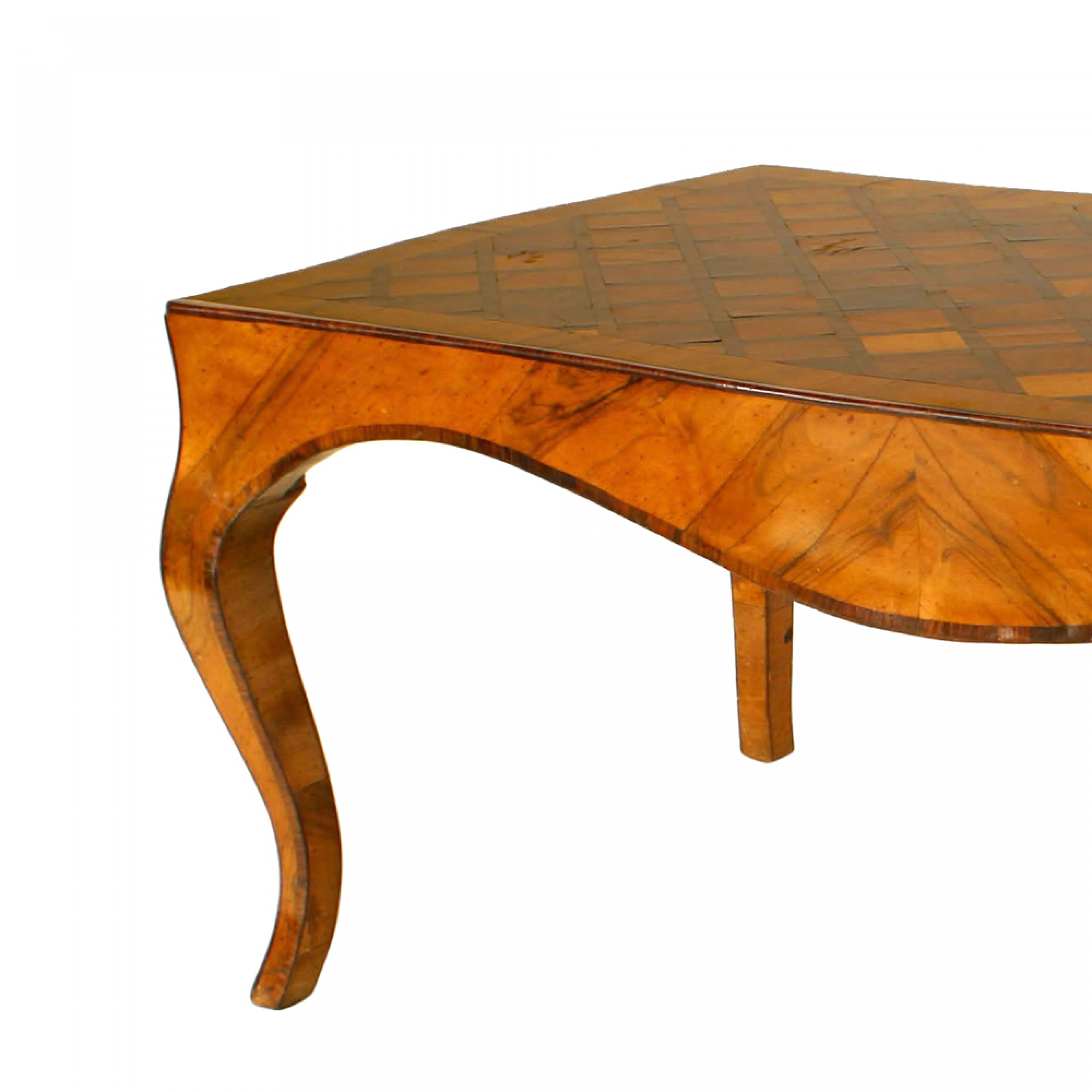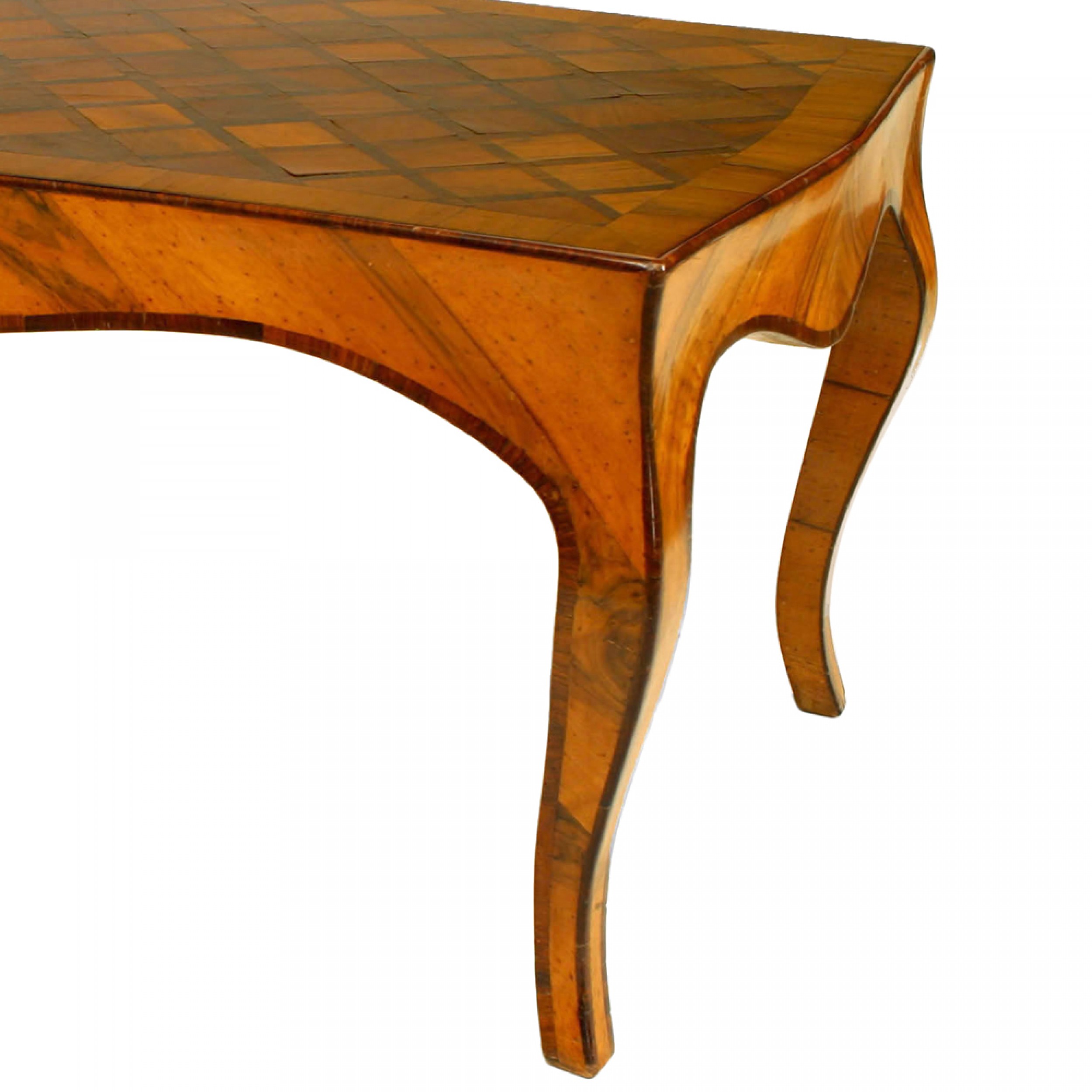 French Louis XV-style (20th Century) walnut and fruitwood coffee table with a shaped top inlaid with a parquetry design of squares..
