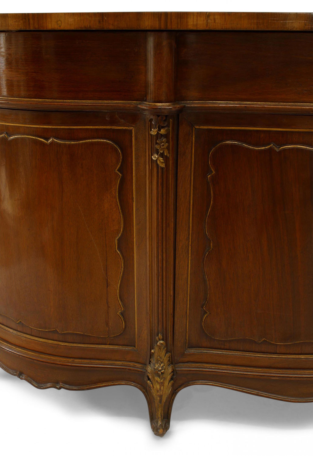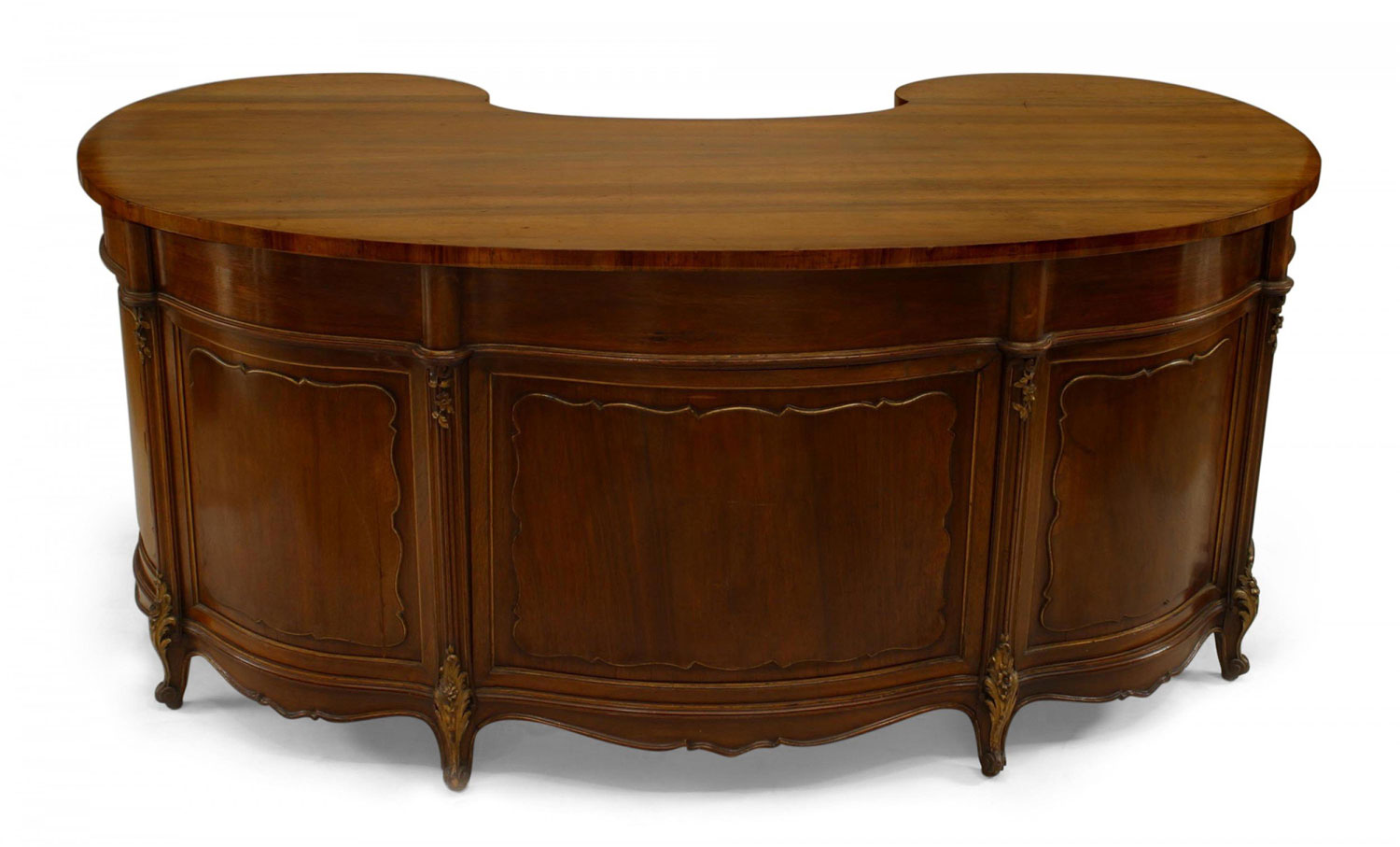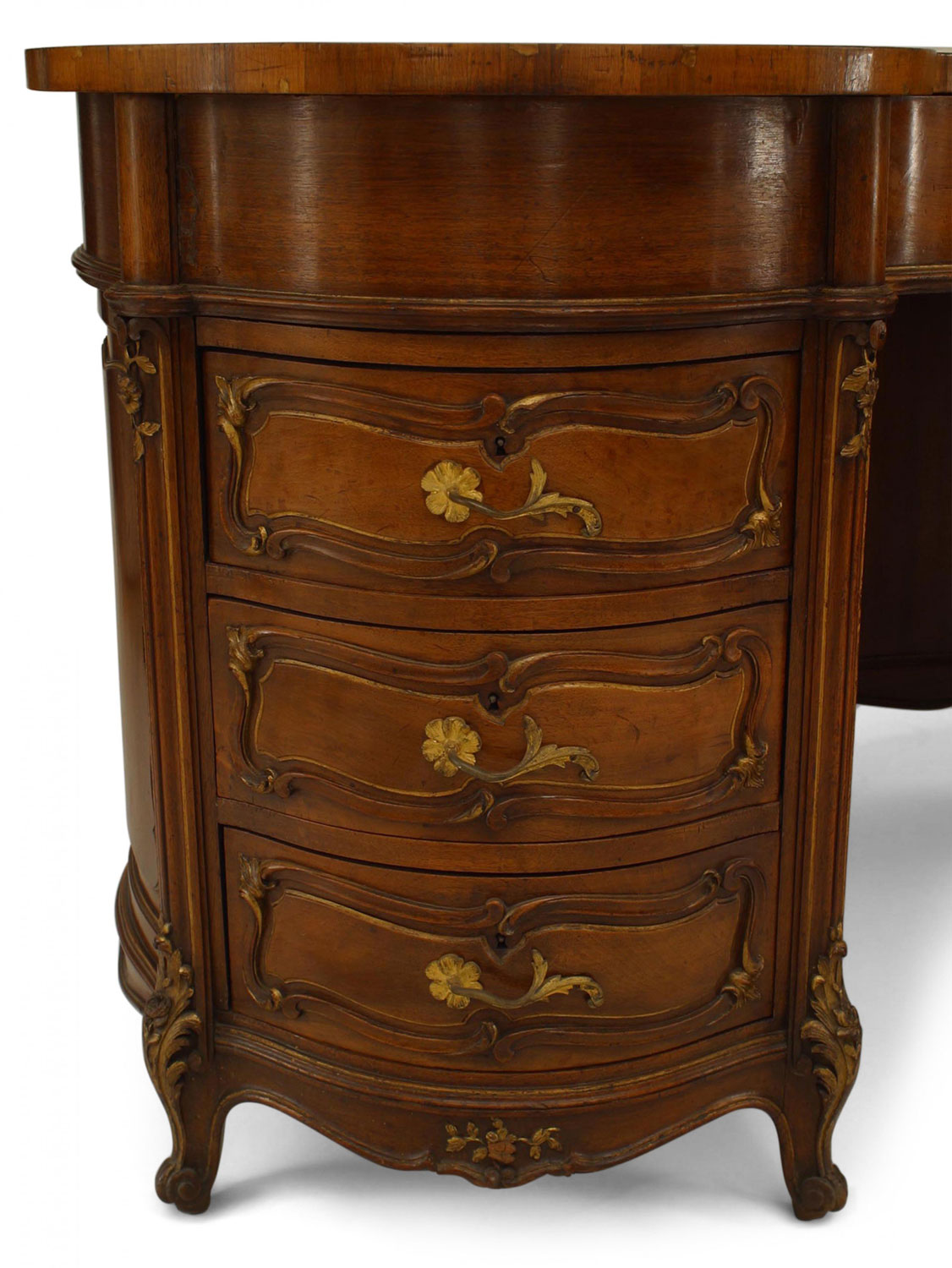 French Louis XV style (19th Century) walnut kidney shaped kneehole desk with gilt trim and brass scroll handles..