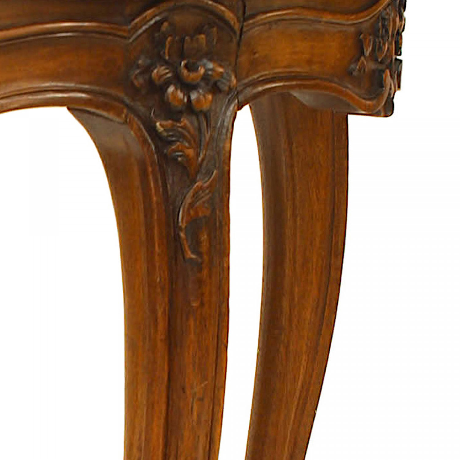 French Louis XV-style (19/20th Century) walnut round end table with open stretcher and white and green marble top.