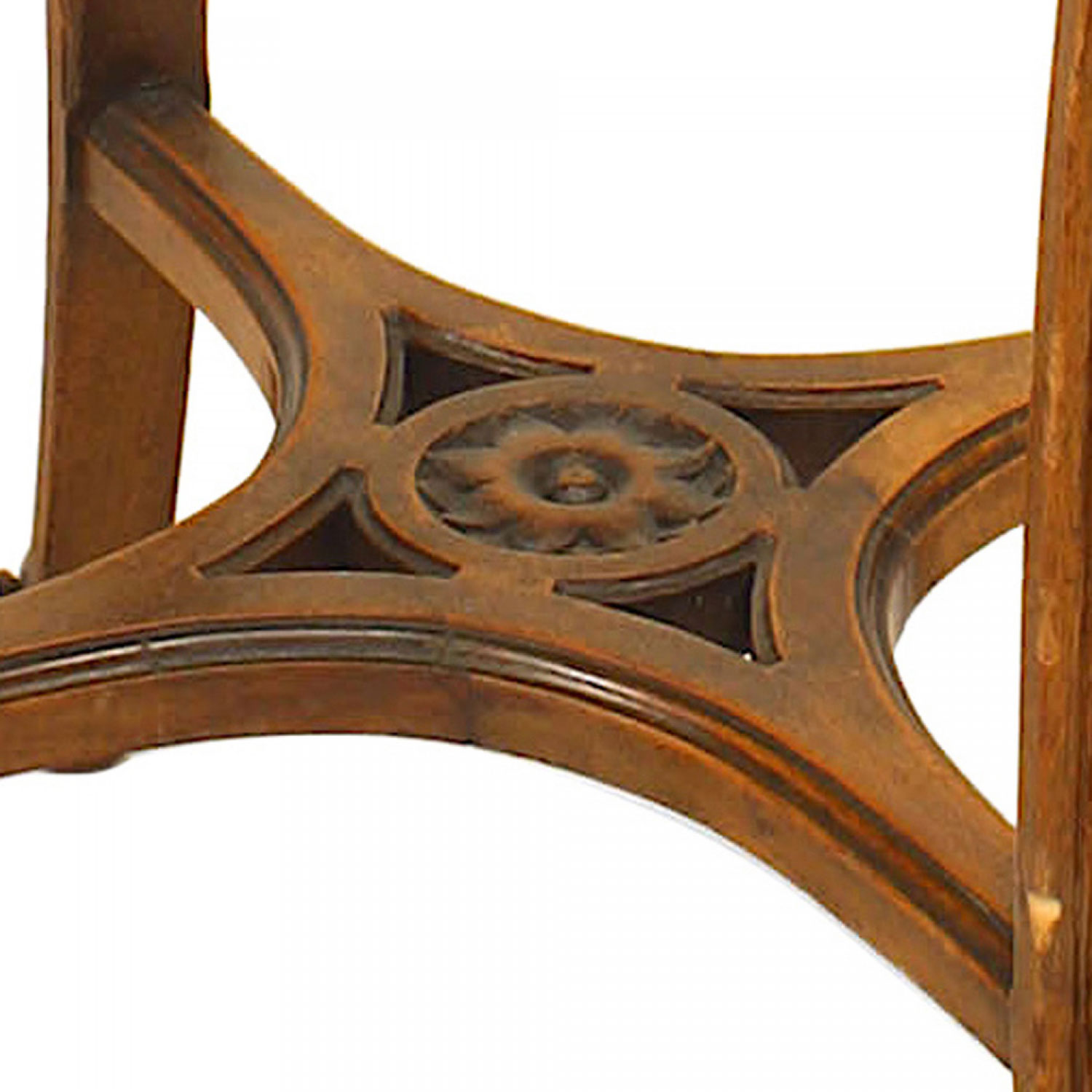 French Louis XV-style (19/20th Century) walnut round end table with open stretcher and white and green marble top..