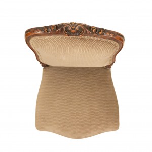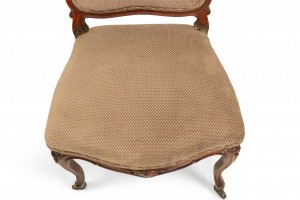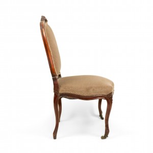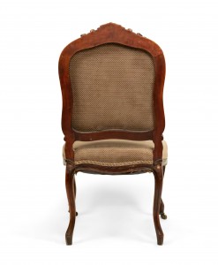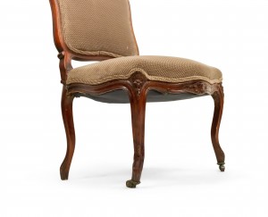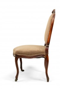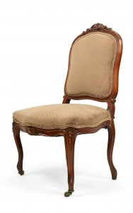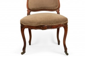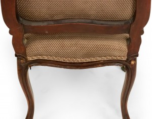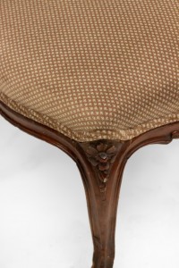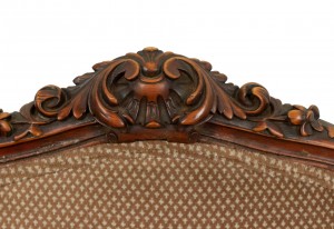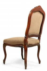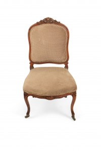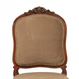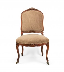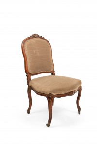 Style: French Materials & Techniques: Walnut, carved, crest Category: Seating Condition: Former visible repair on chair leg, as is.
