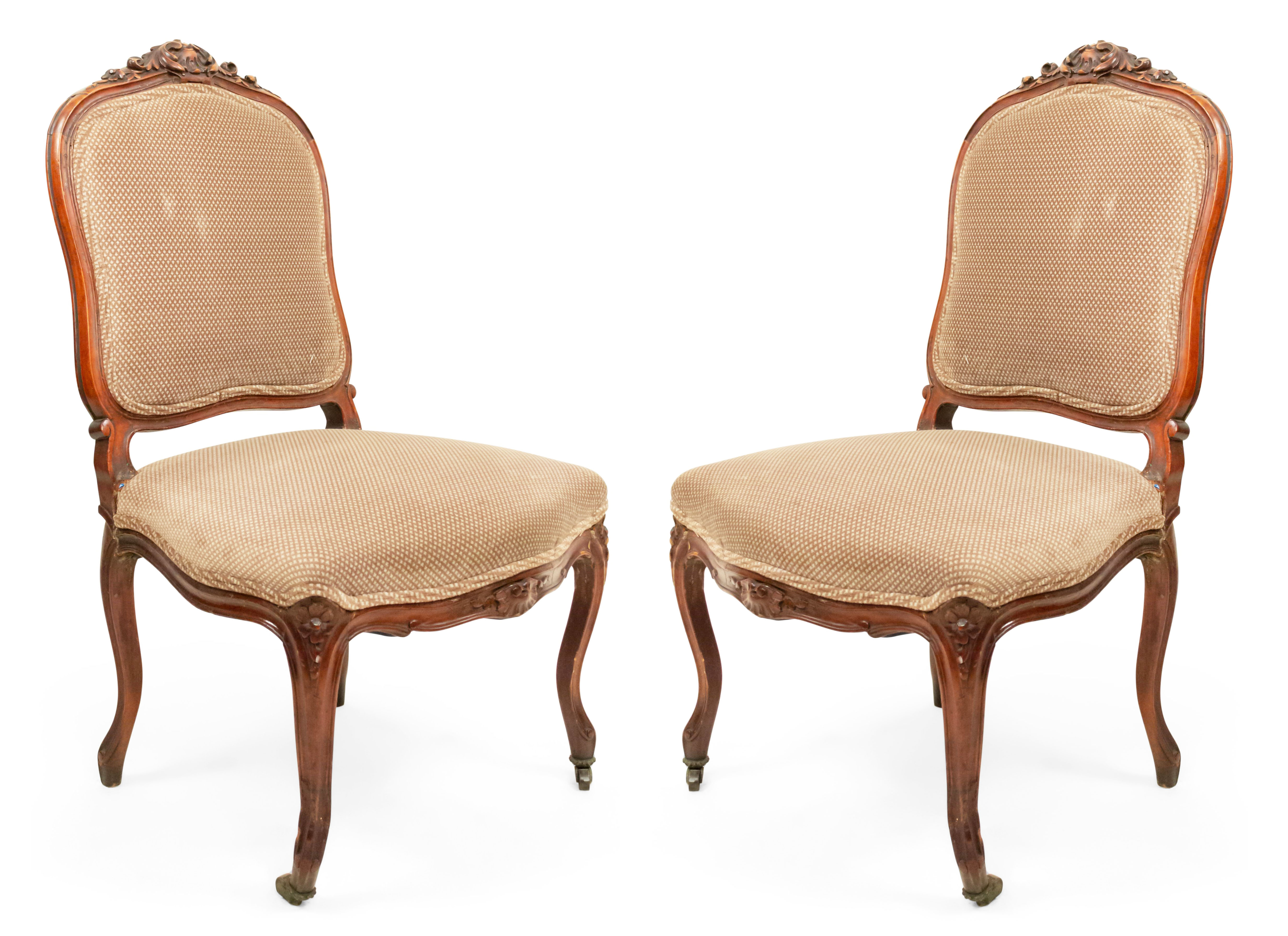 PAIR of French Louis XV style (19th Cent) walnut side chairs with a carved back crest and brown upholstered seat and back (1 leg as is).