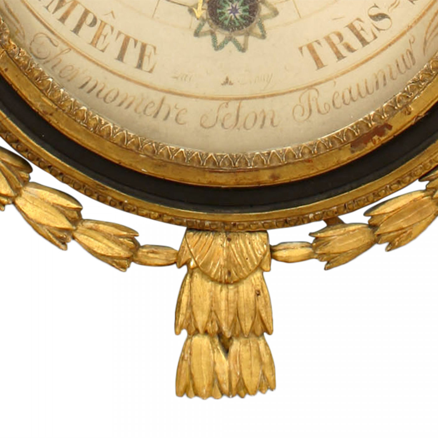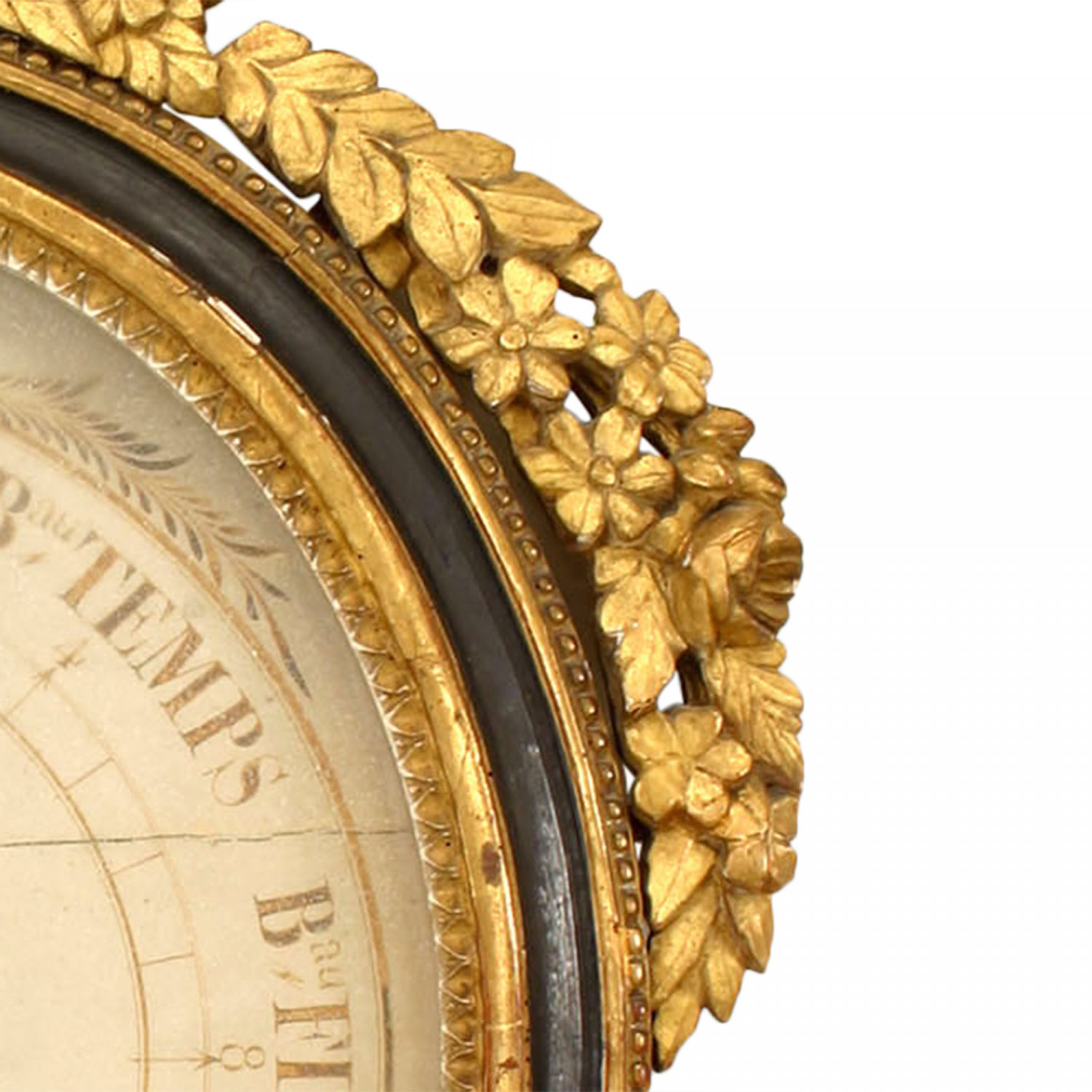 French Louis XVI (18th Century) barometer with original scientific illustrations and mercury vial framed with gilt foliate carvings & ebonized trim and a perched eagle pediment.