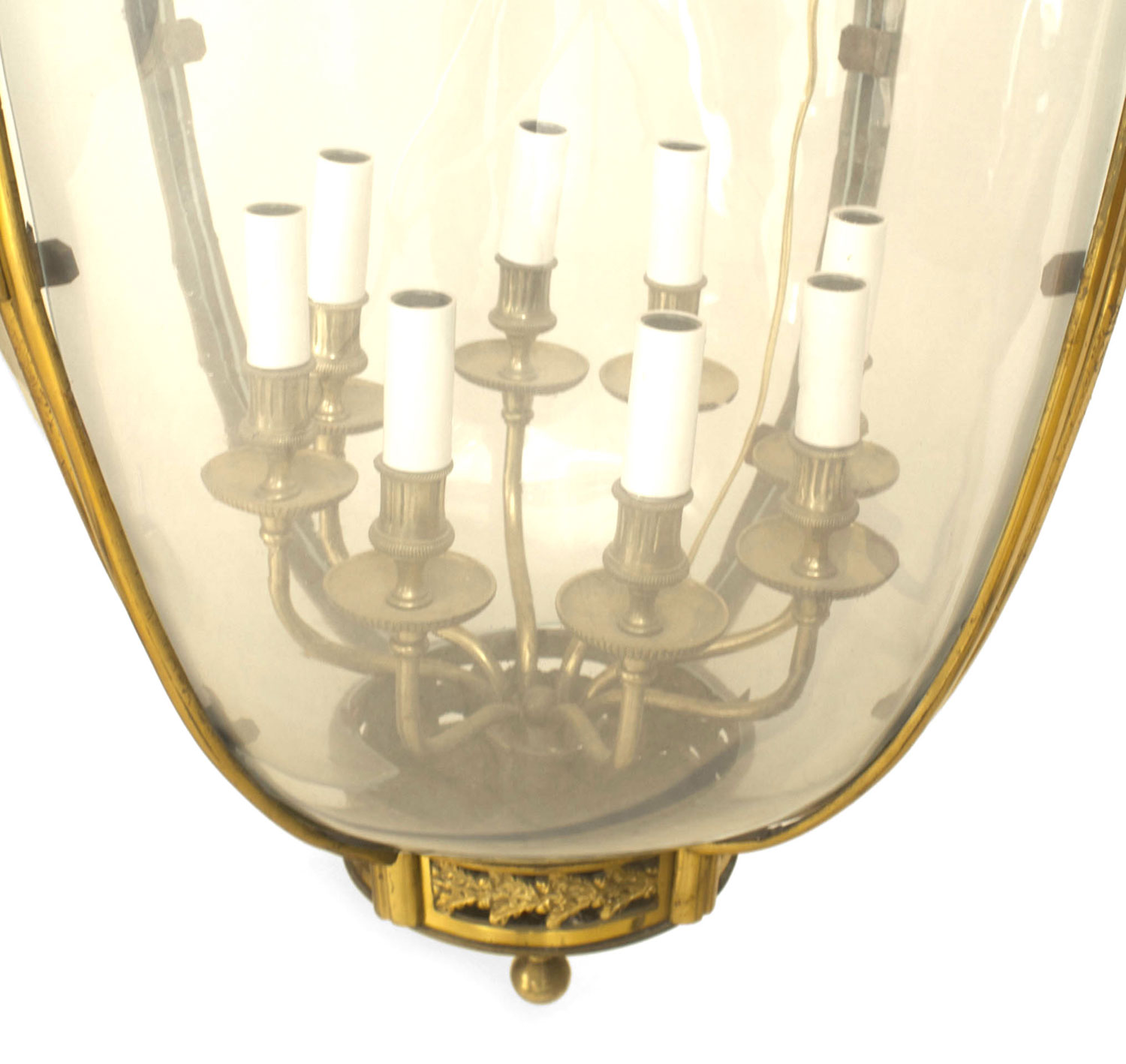 French Louis XVI style (20th Century) bronze dore round tapered shaped hanging lantern with 4 glass panels and 8 arms.