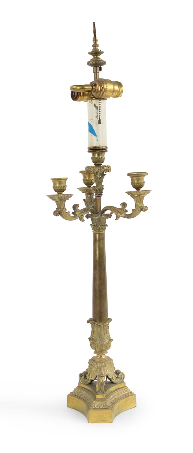 French Louis XVI style (19th Century) 3 arm candelabra with a column over a triangular base with claw feet now wired as a lamp..