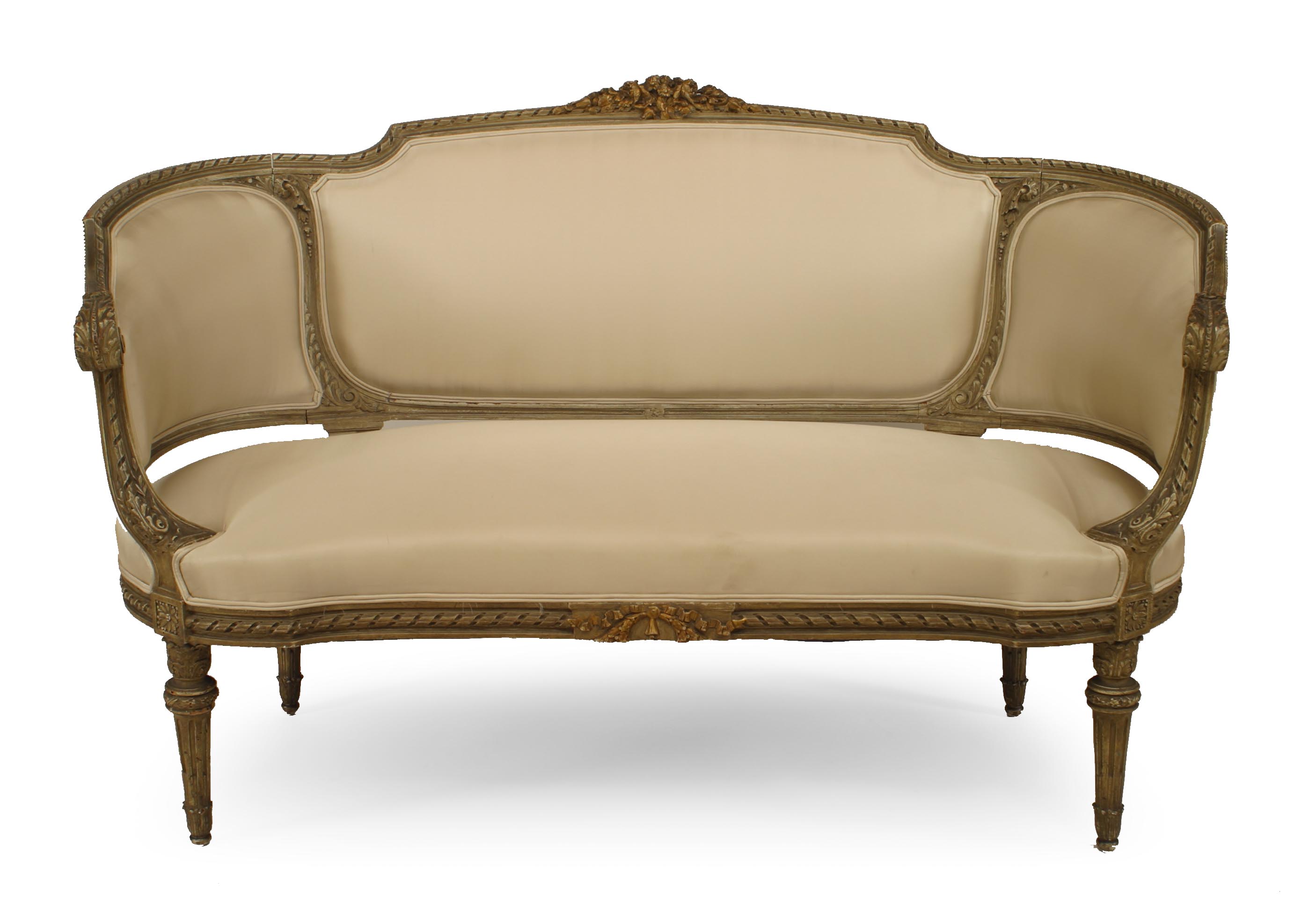 French Louis XVI style (19th Cent) grey painted loveseat with rounded sides and carved back crest with upholstered back, sides and seat with cushion