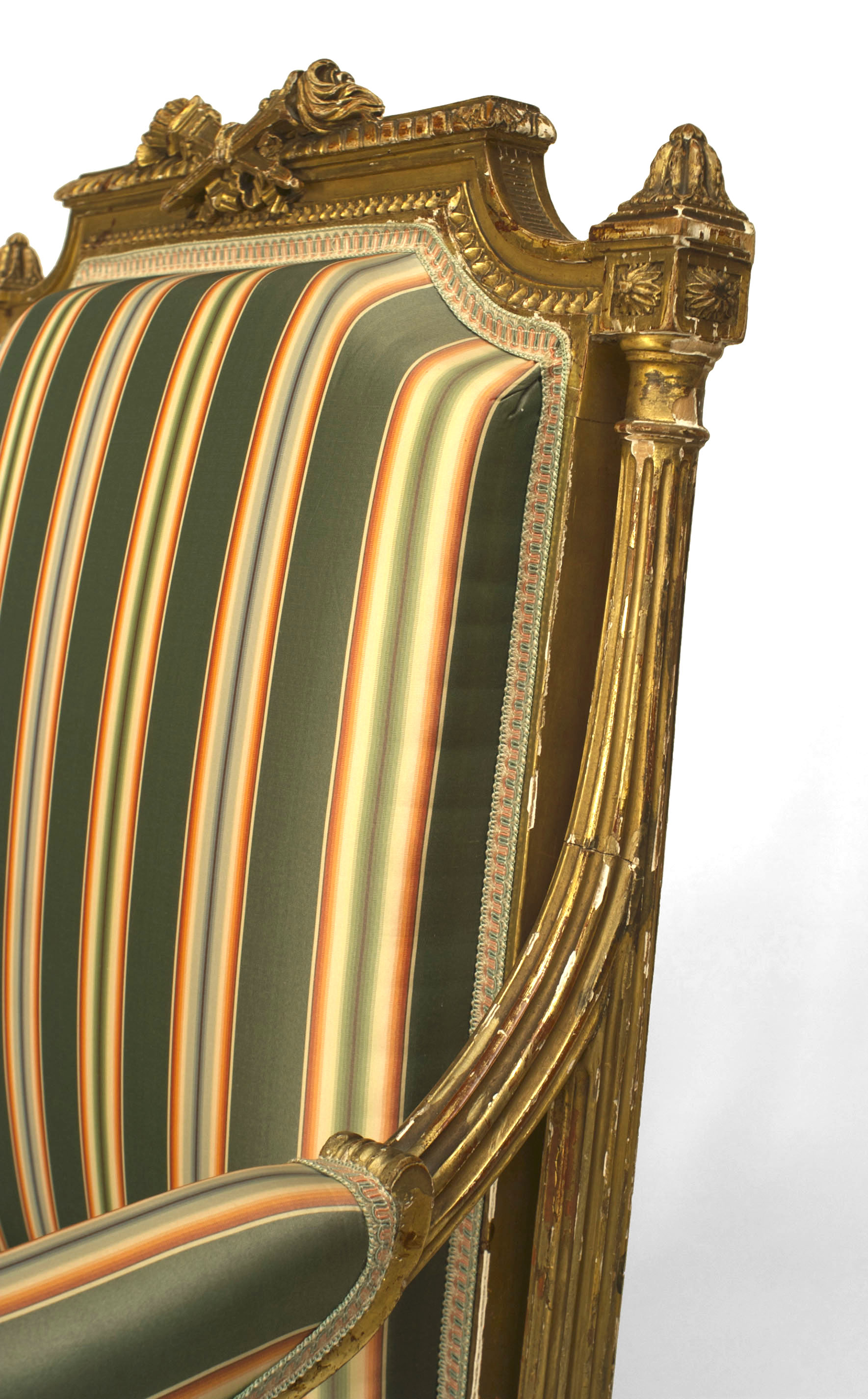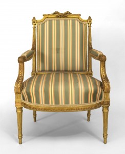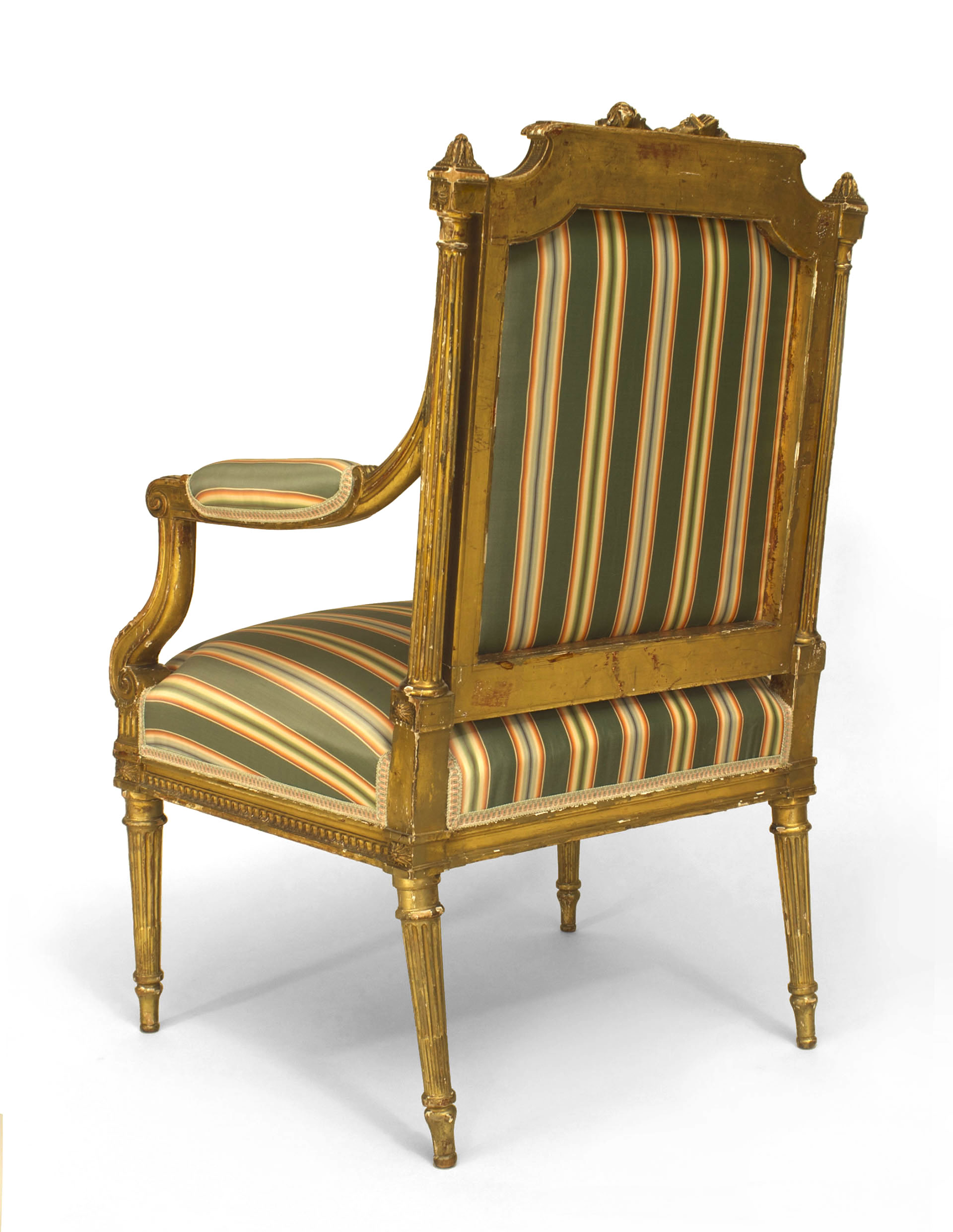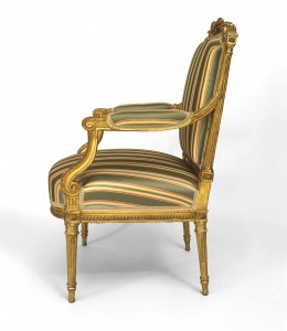 French Louis XVI style (19th Cent) gilt open arm chair with carved crossed torches on back crest and upholstered in green stripe damask.