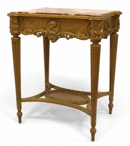 French Louis XVI-style (19th Century) gilt rectangular end table with open cane stretcher and rouge marble top.