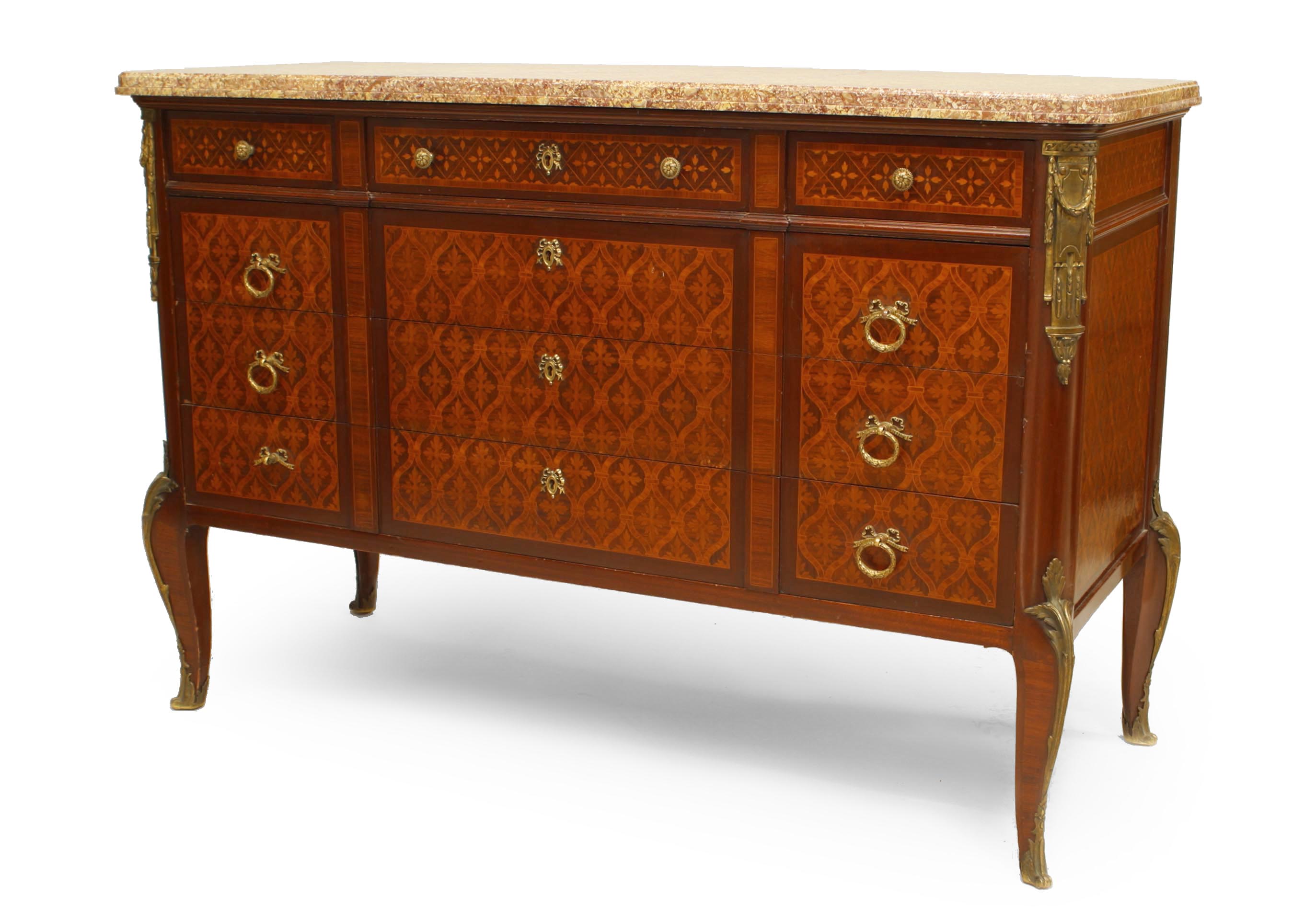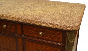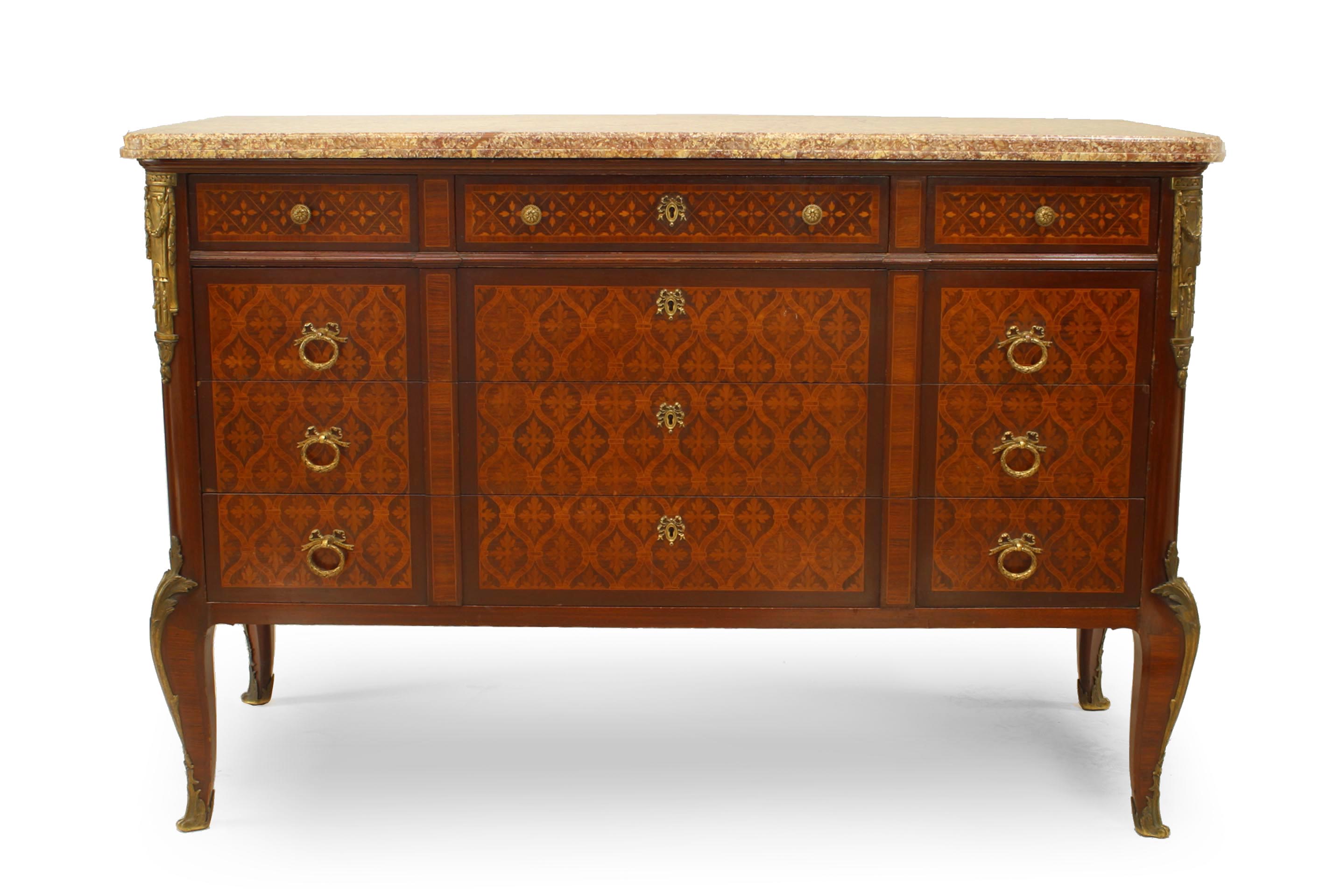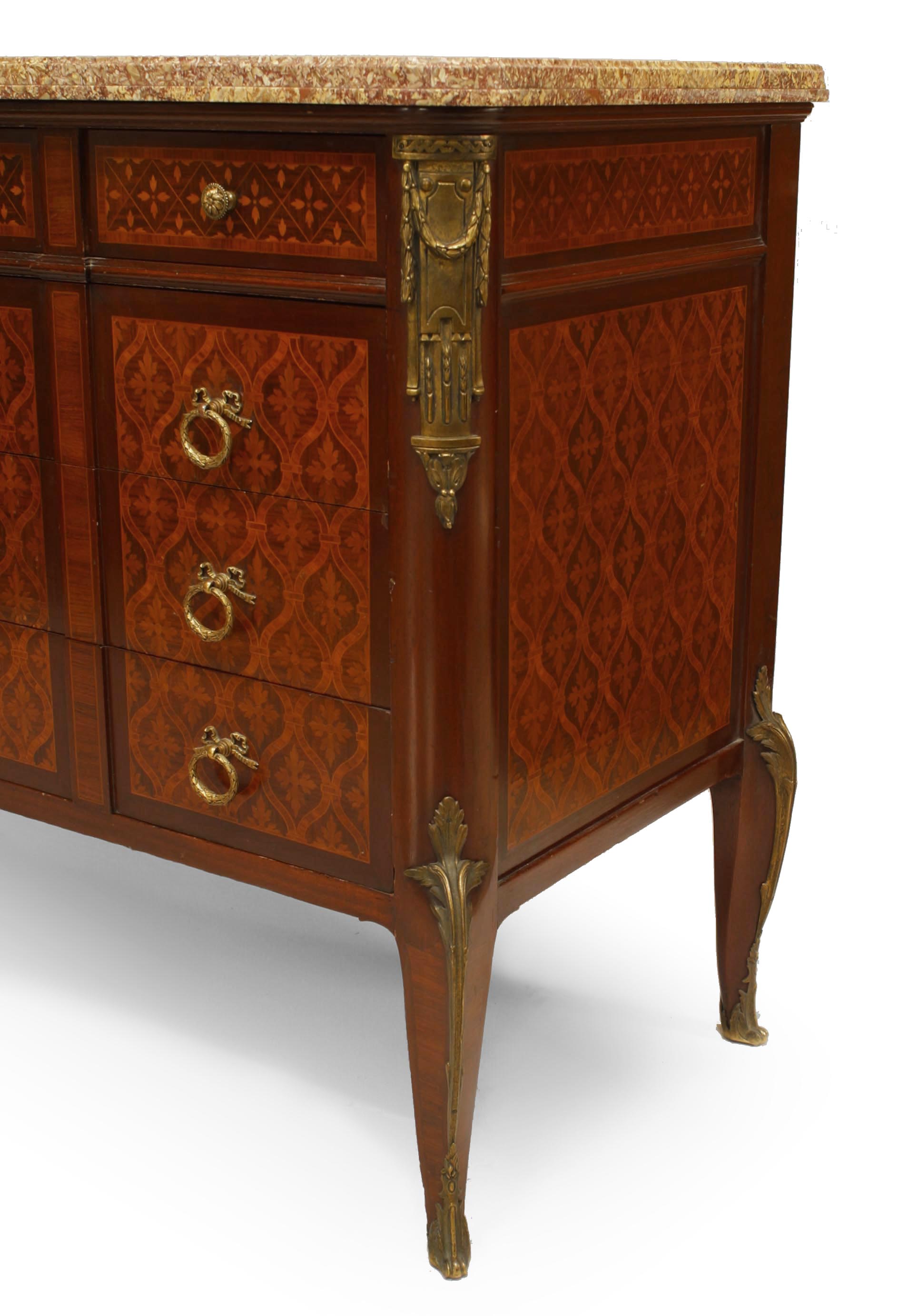 French Louis XVI 6 drawer commode with bronze trim and marquetry inlaid veneer with a marble top.