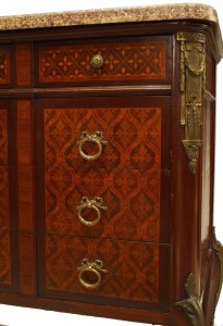 Style: French Materials & Techniques: Marble, veneer, bronze, inlaid Category: Tables, Cabinets & Case Goods, Dining Room