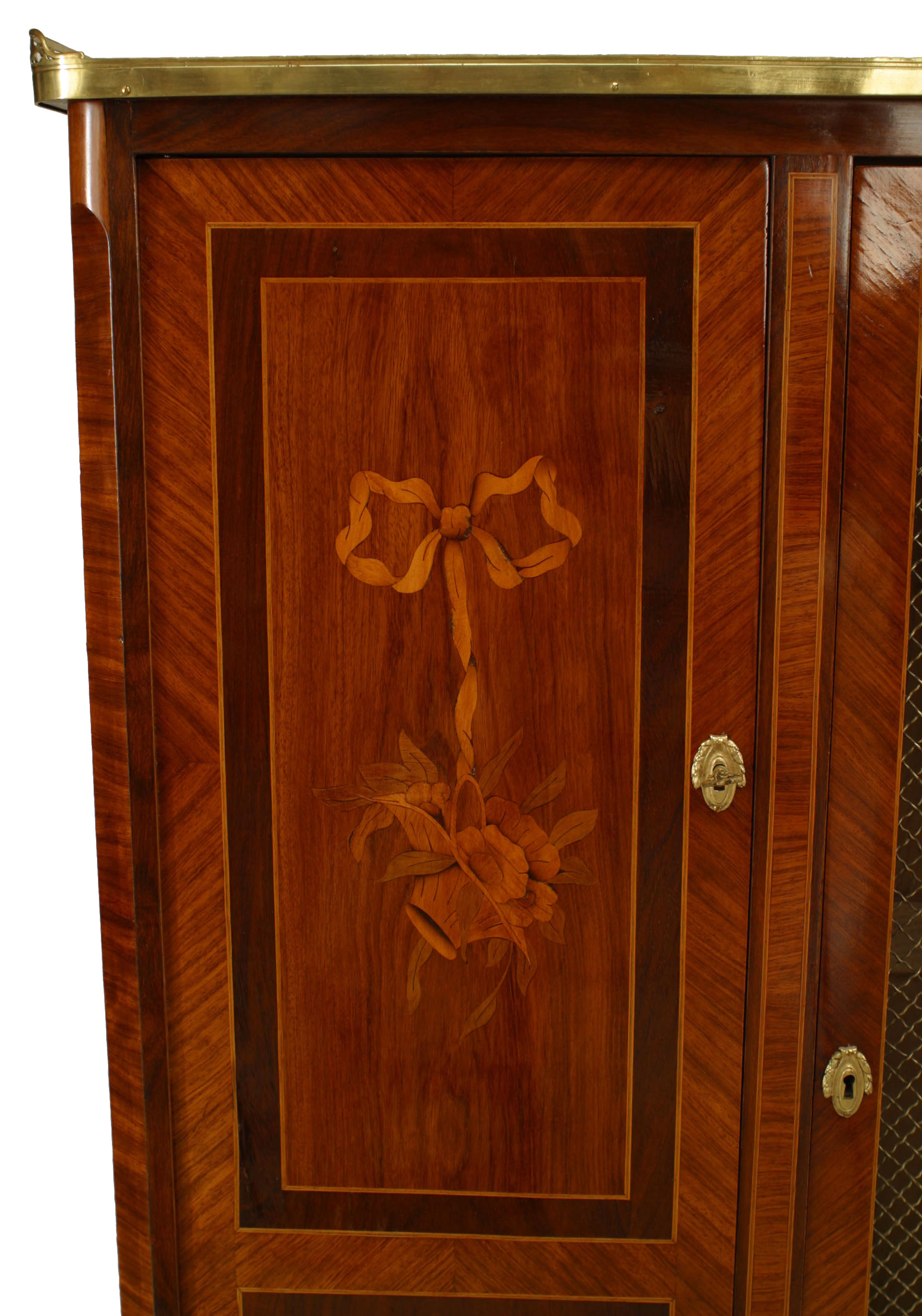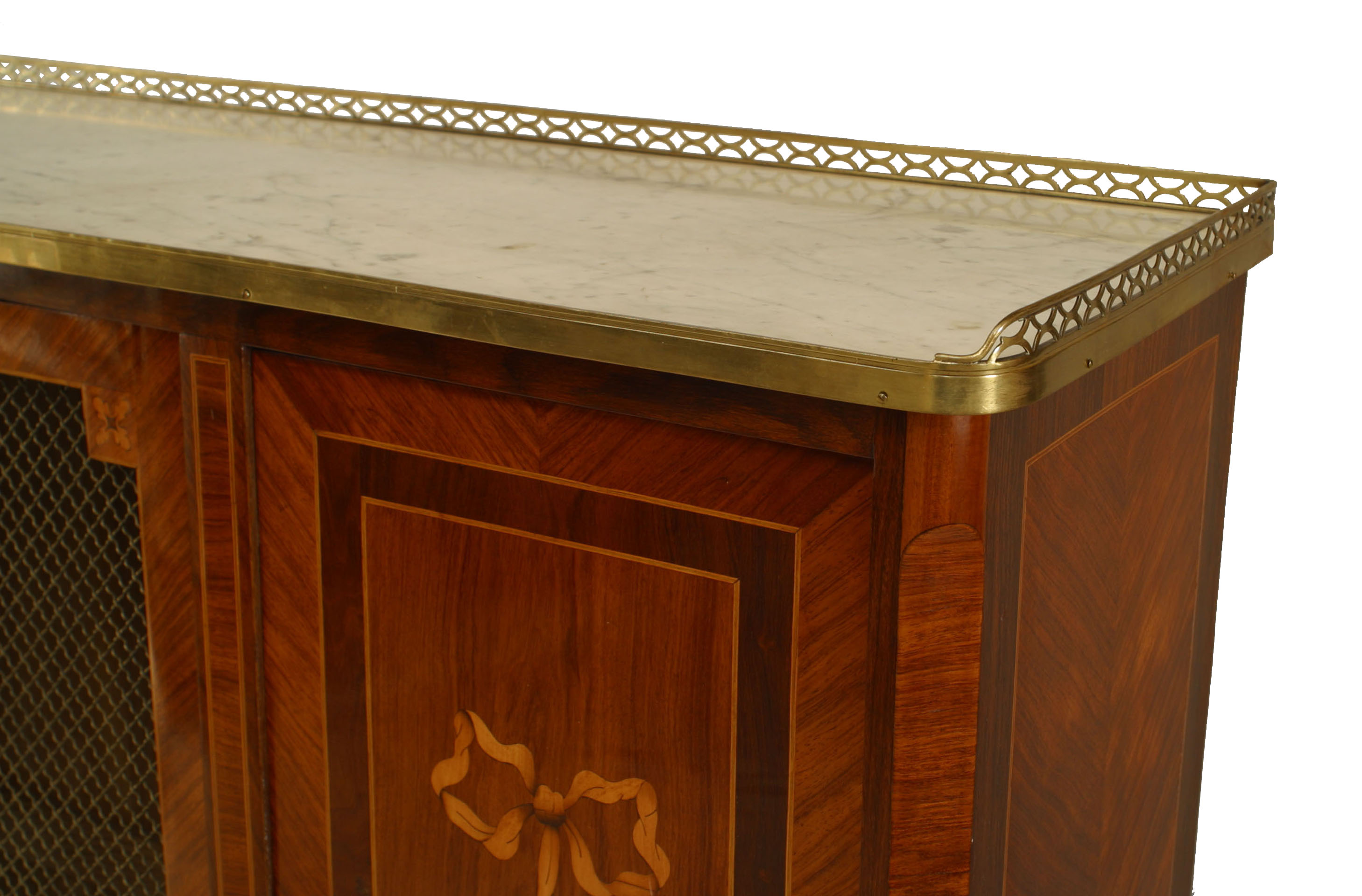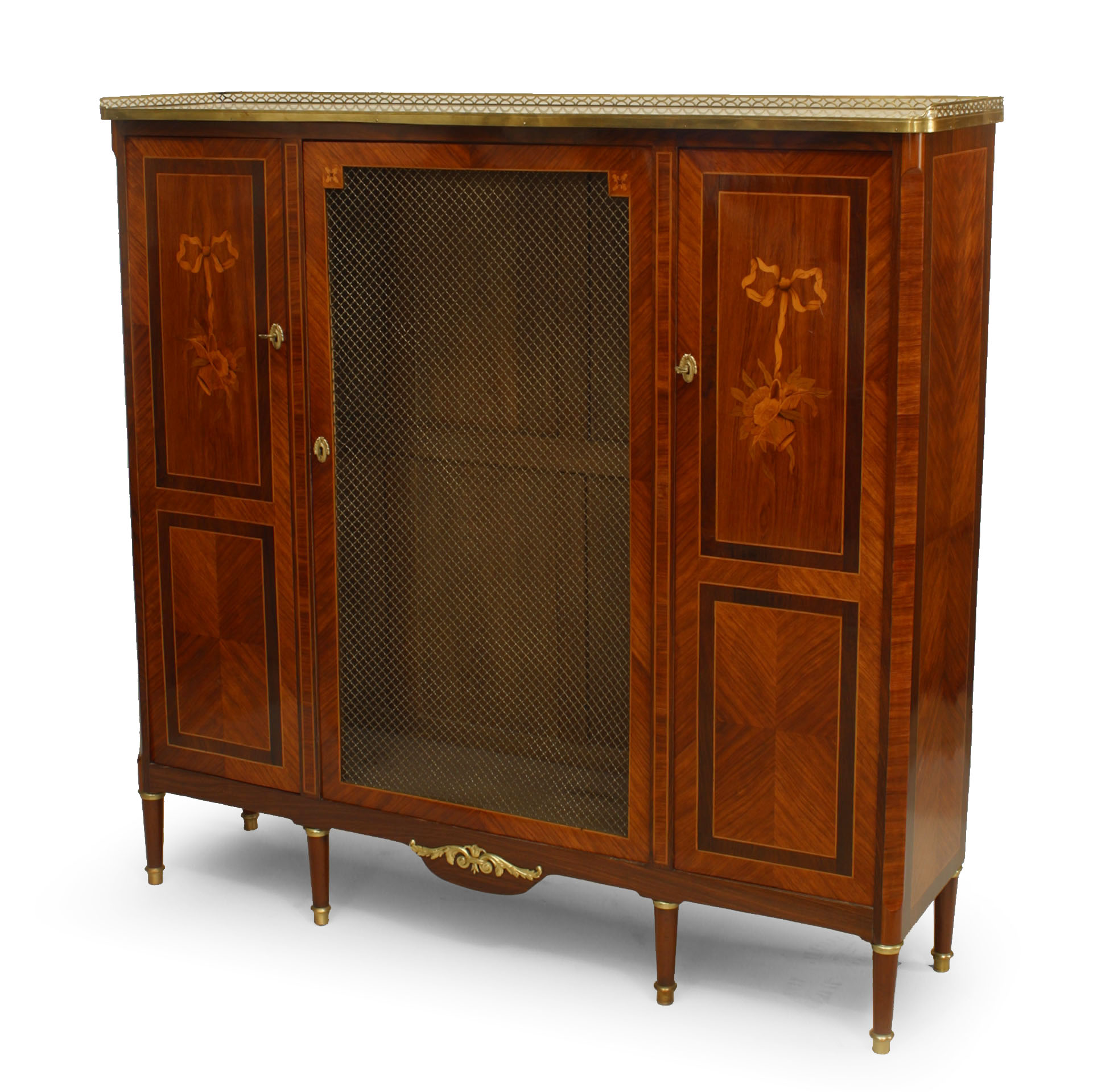 French Louis XVI style (19th Century) kingwood and inlaid veneer high cabinet with 3 doors grill center door with a white marble top with gallery and gilt bronze trim..