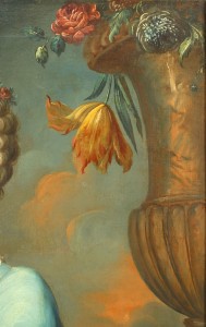 French Louis XVI (18th Cent) oil painting portrait of a lady in a blue dress with lace trim & flowers in her hair holding a book seated next to a large urn in a stripped carved frame (att: JEAN-MARC NATTIER) (companion portrait of man: 029046)