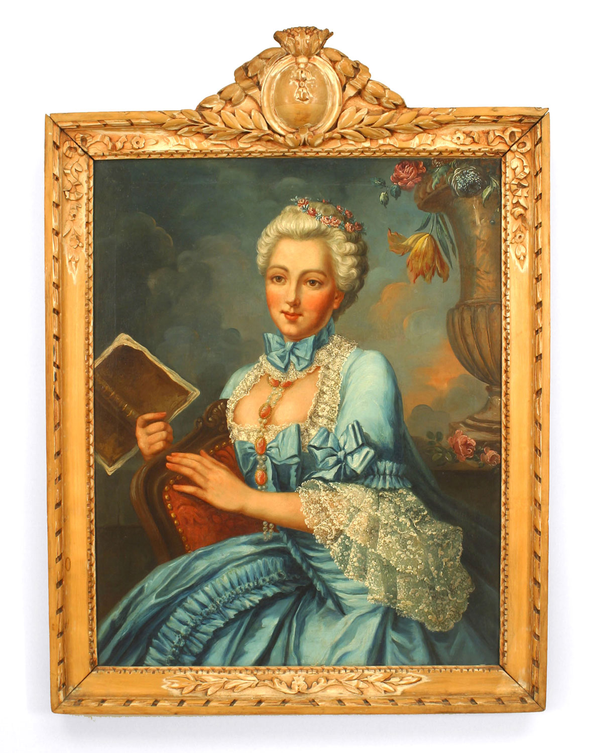 French Louis XVI (18th Cent) oil painting portrait of a lady in a blue dress with lace trim & flowers in her hair holding a book seated next to a large urn in a stripped carved frame (att: JEAN-MARC NATTIER) (companion portrait of man: 029046).