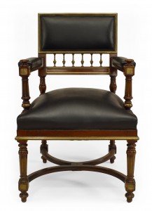 Style: French Materials & Techniques: Wood, brass, mahogany, leather Category: Seating Condition: Antique condition. Shows wear and tear.