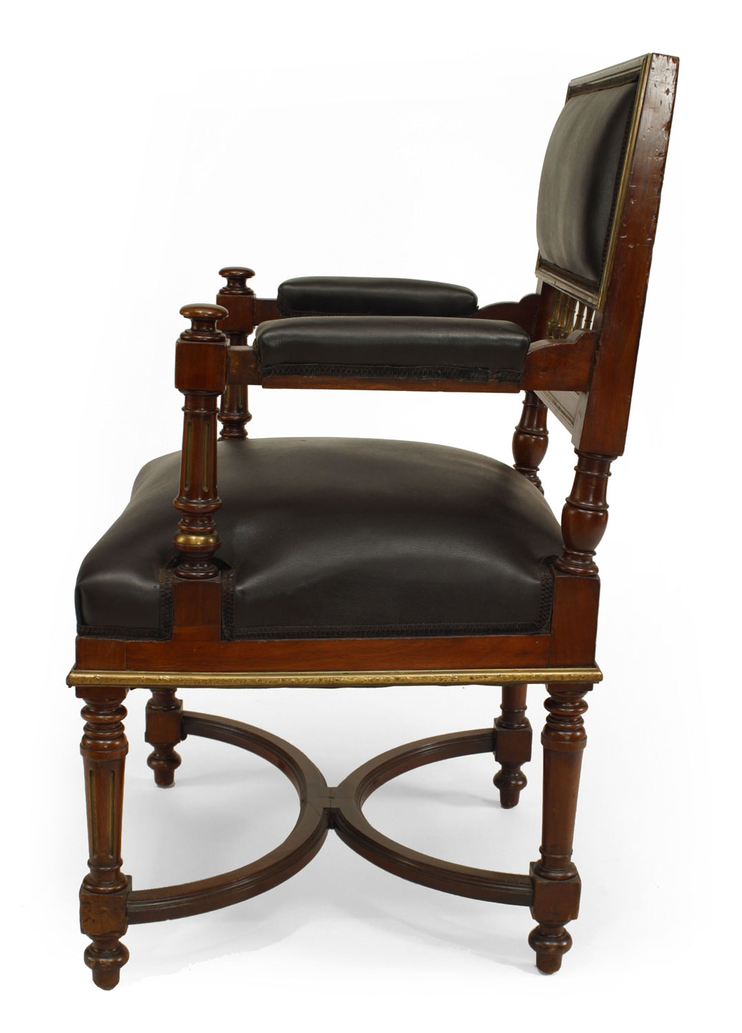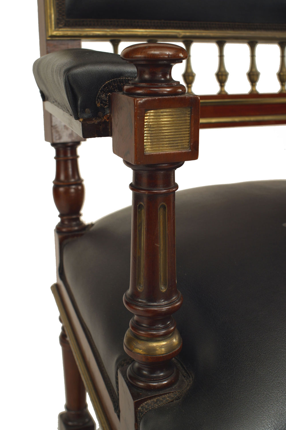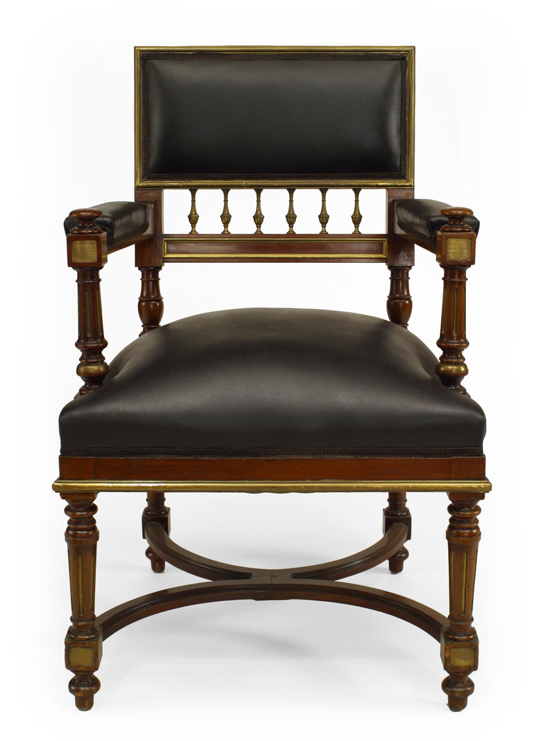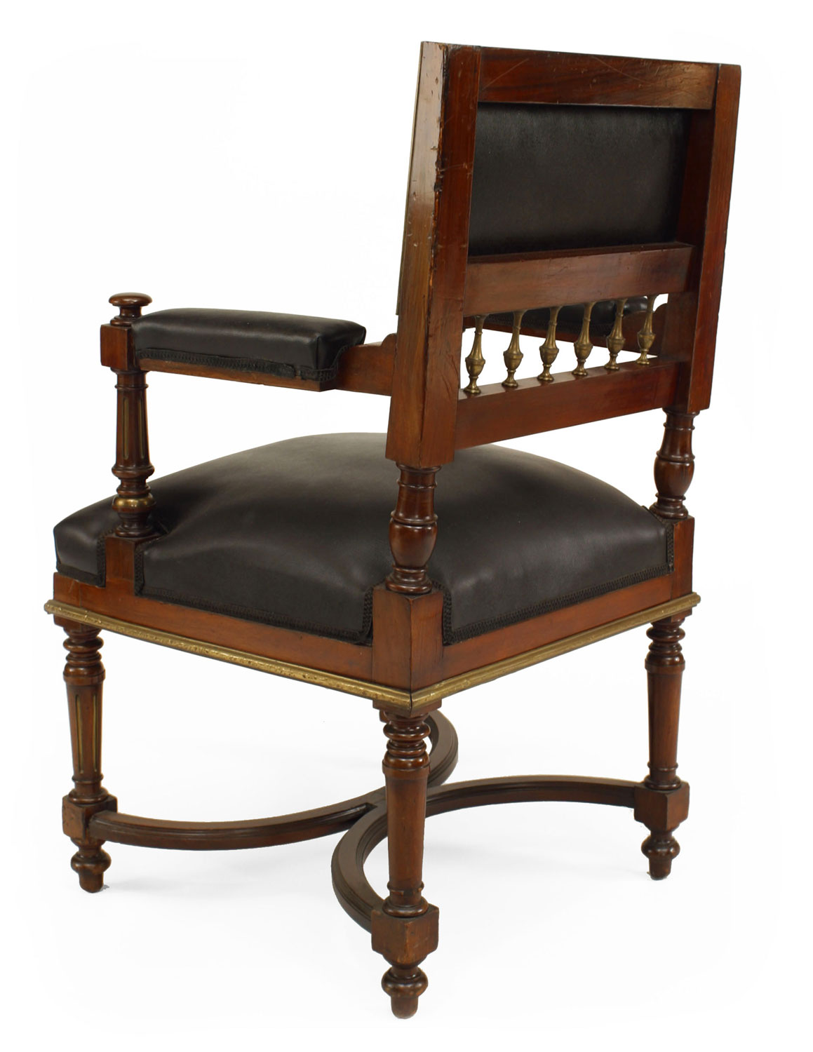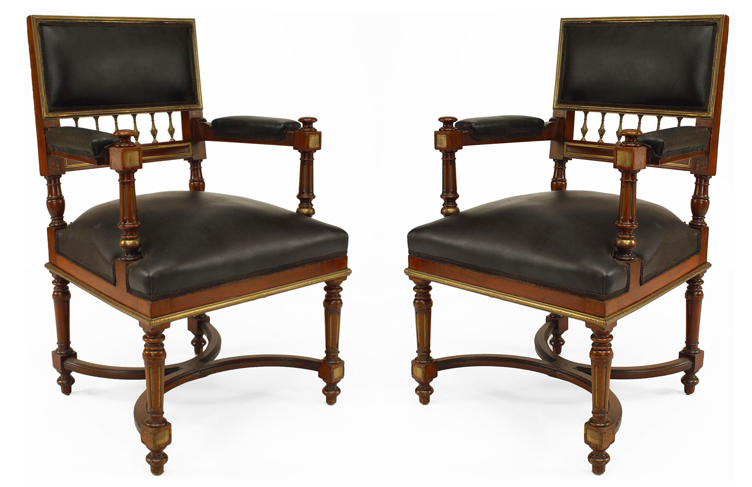 PAIR of French Louis XVI-style (19th Century) mahogany arm chairs with brass trim, spindle detail, and black leather upholstery.