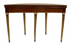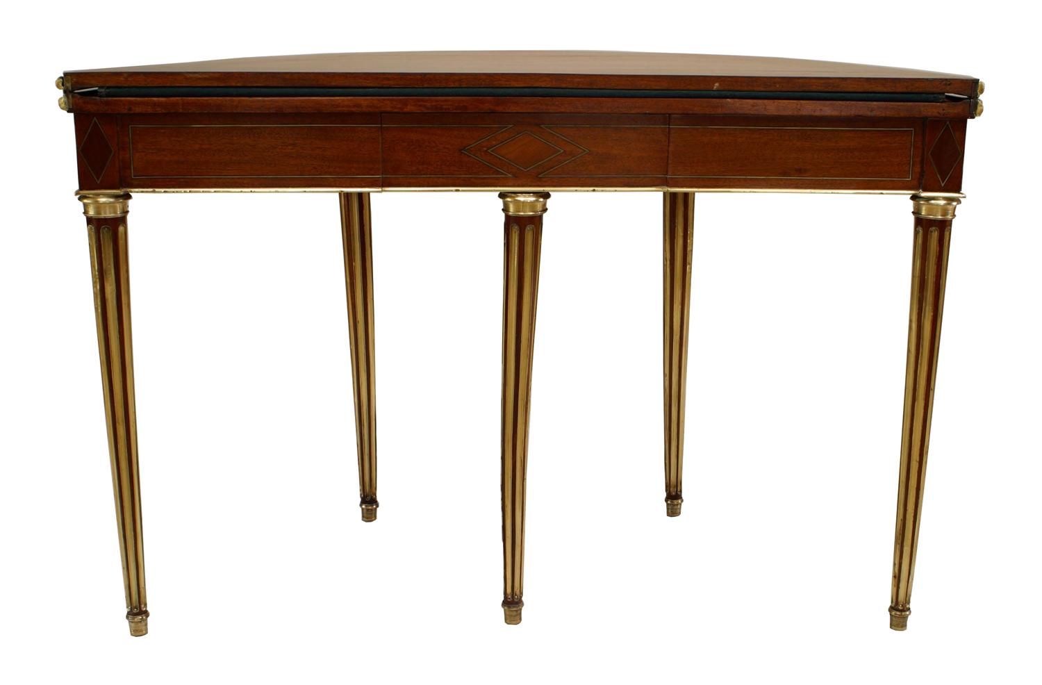 French Louis XVI mahogany and inlaid flip top demilune shaped console card table with brass fluted legs and trim with green felt top with fifth leg as drawer