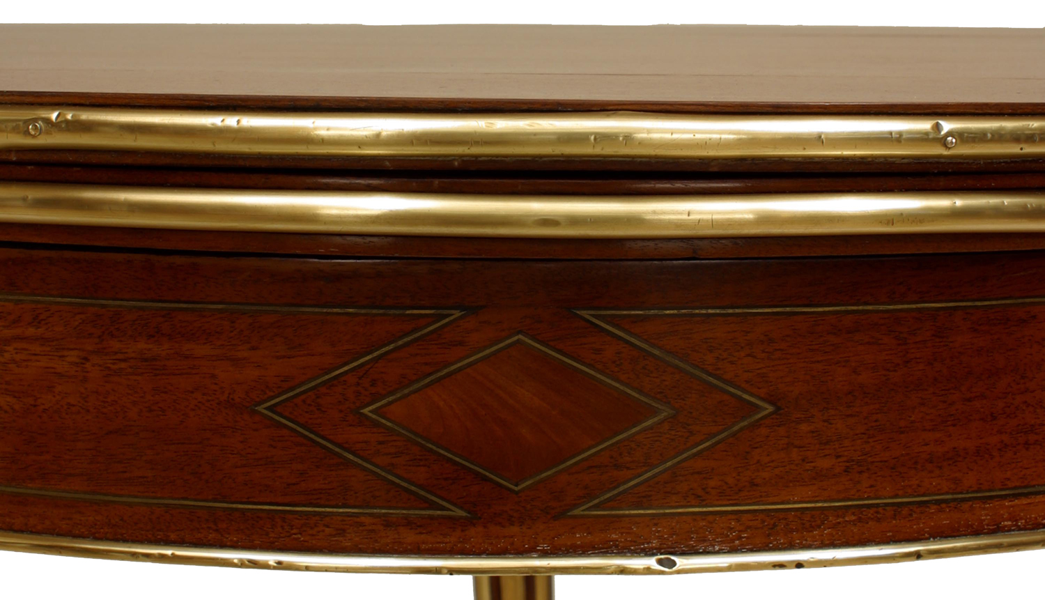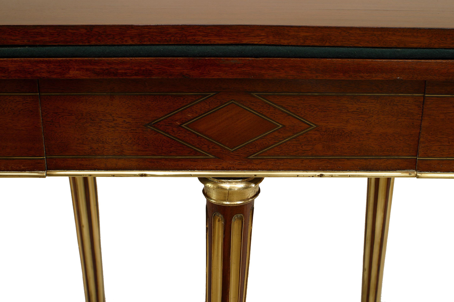 French Louis XVI mahogany and inlaid flip top demilune shaped console card table with brass fluted legs and trim with green felt top with fifth leg as drawer.
