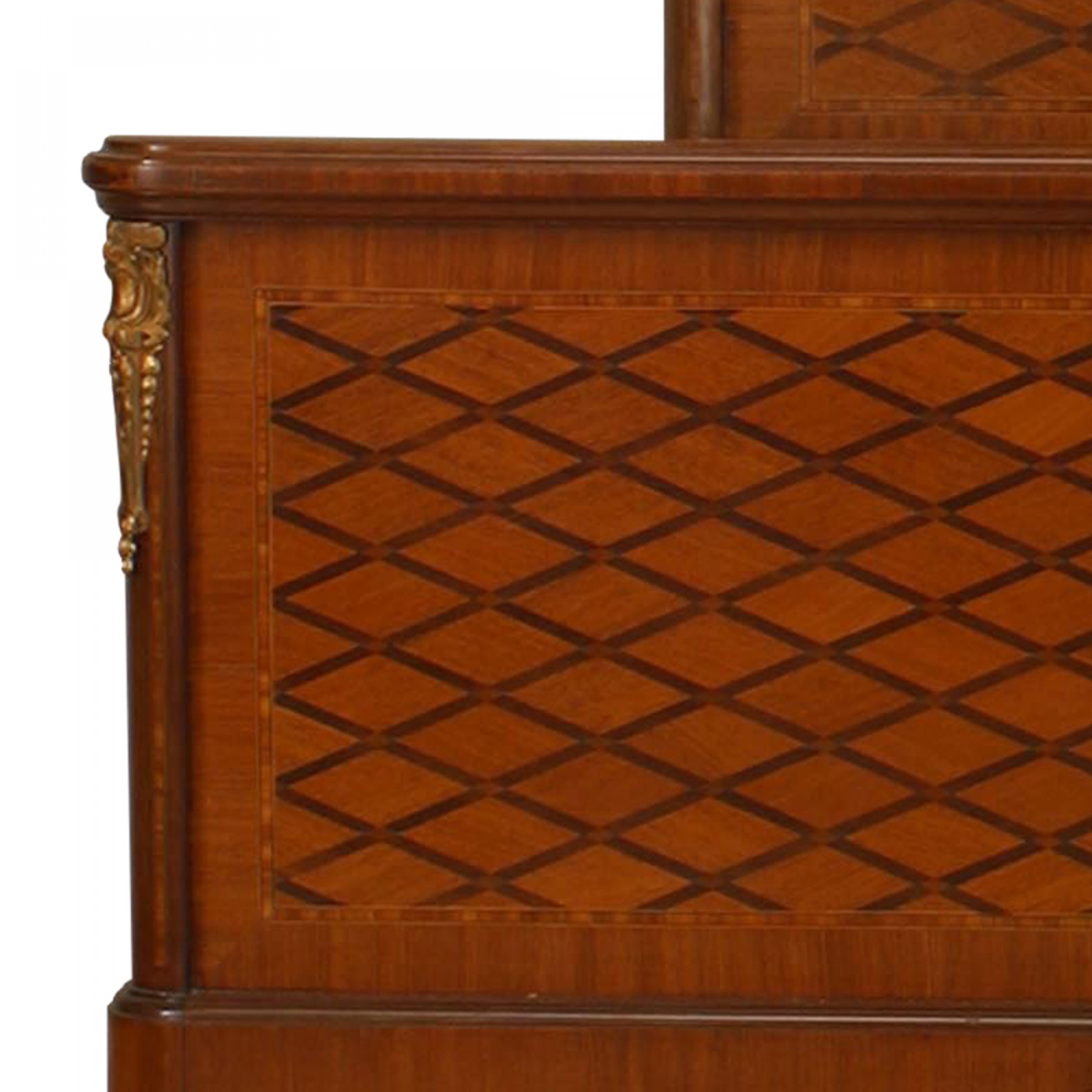 French Louis XVI-style full size mahogany bed with gilt bronze ormolu mounts & marquetry inlay (includes: headboard, footboard, rails).