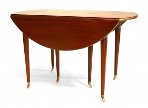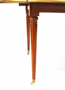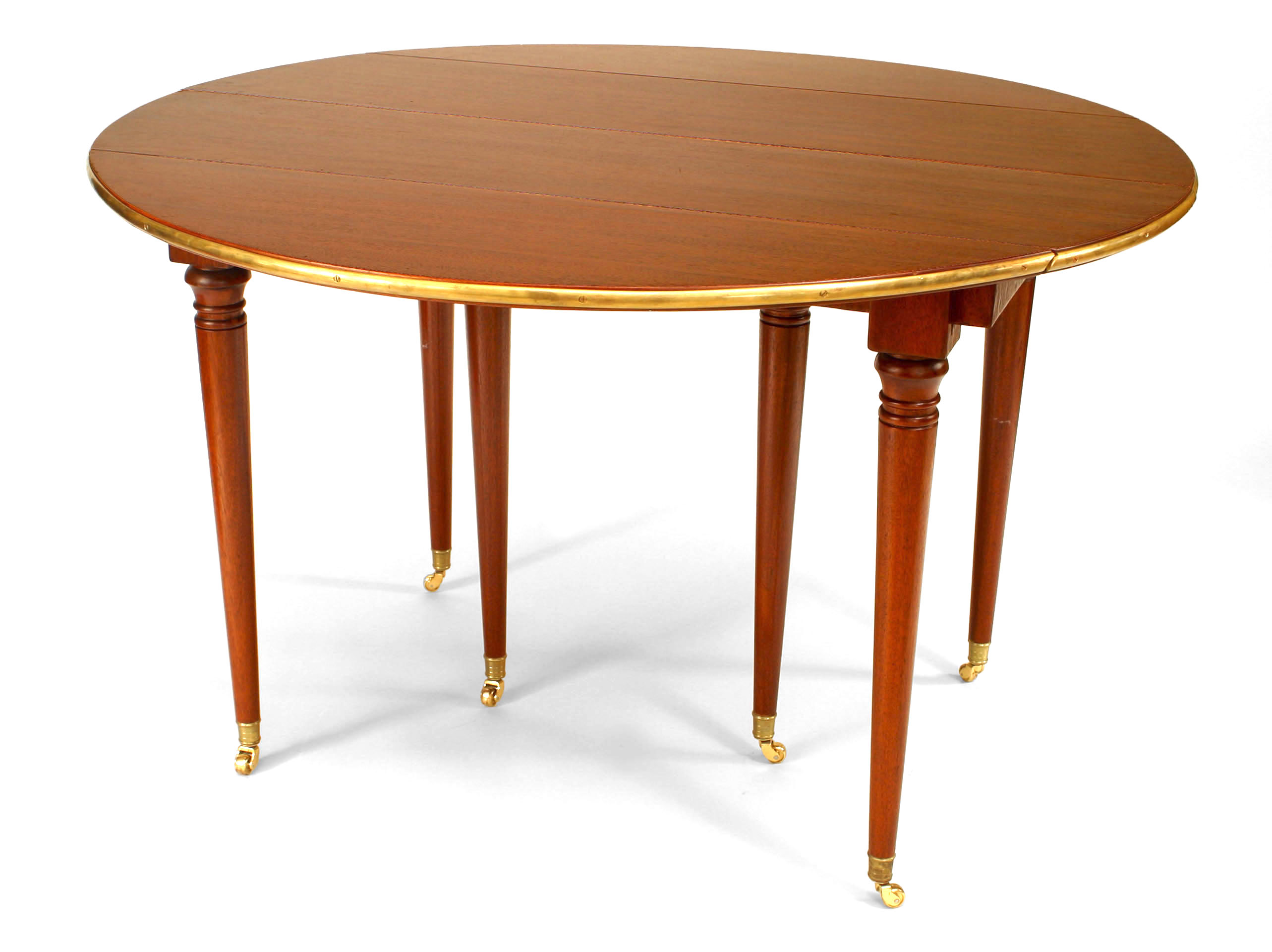 French Louis XVI-Style (19th Century) mahogany round (opened) dining table with drop sides and a brass rim supported on round tapers legs with casters (3 leaves at 18" each)